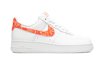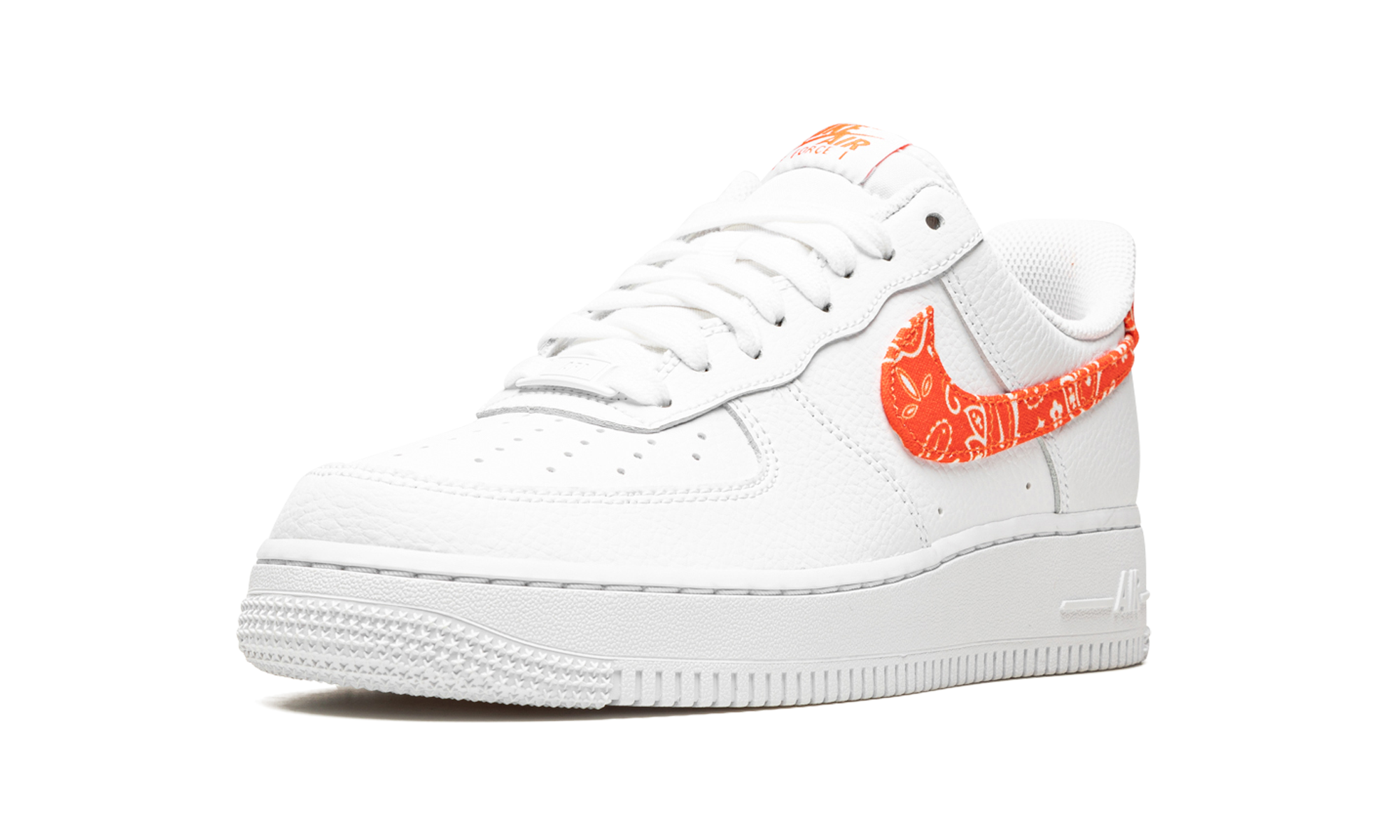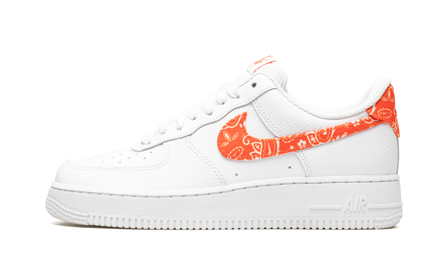 La Nike Air Force 1 Low "Orange Paisley" da donna è una colorazione esclusiva femminile della scarpa da basket e lifestyle retrò che reinterpreta uno dei design più popolari del modello. La scarpa in questione è la colorazione "White on White" dell'Air Force 1, che è l'ispirazione dietro l'aspetto prevalentemente monocromatico in pelle bianca della "Orange Paisley". Naturalmente, la "Orange Paisley" si differenzia dalla "White on White" per la presenza di un logo Swoosh paisley arancione acceso sui lati e sulla linguetta sul tallone della scarpa. La base della tomaia è realizzata in pelle bianca. Sotto il piede, un'intersuola in gomma bianca con il marchio "Air" tono su tono sul lato completa il look. Orange Paisley