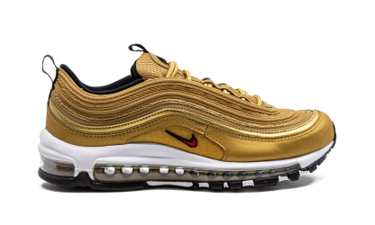 The Nithtke Air Max 97 “Gold Bullet” is a popular colorway of the retro performance running shoe that channels the vibe of the model’s “Silver Bullet” release. Like the “Silver Bullet,” the Air Max 97’s “Gold Bullet” colorway has an unmistakable design that draws attention everywhere it goes. The shoe’s base is featured in Metallic Gold, as are the wavy leather overlays that wrap around the shoe. A small University Red Swoosh appears on either side above the white foam midsole. The logo is also found on the circular black overlay on the tongue. Red “Air Max” detailing is printed on the heel tab. A full-length Max Air cushioning unit in the midsole completes the design. Gold Bullet 2023