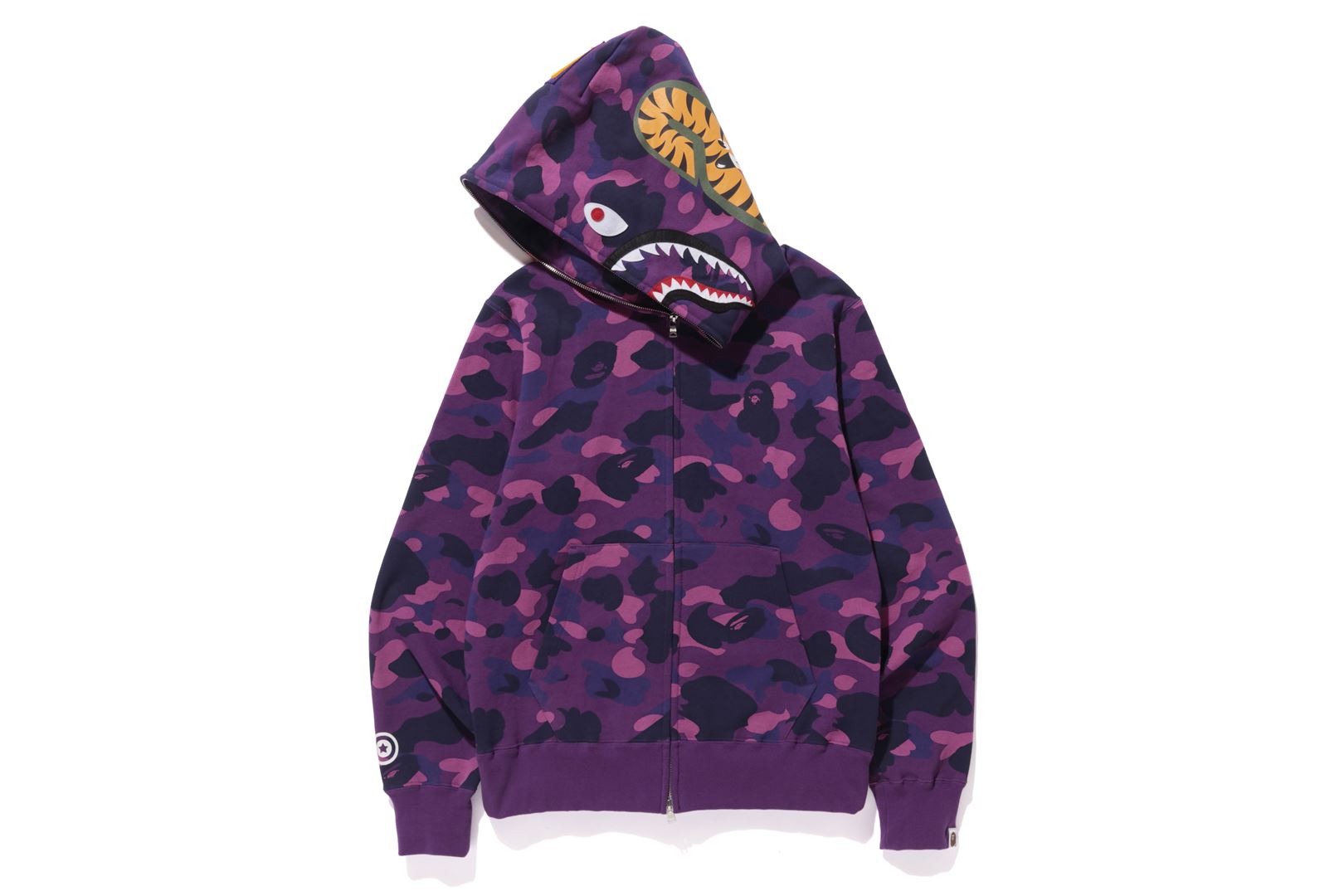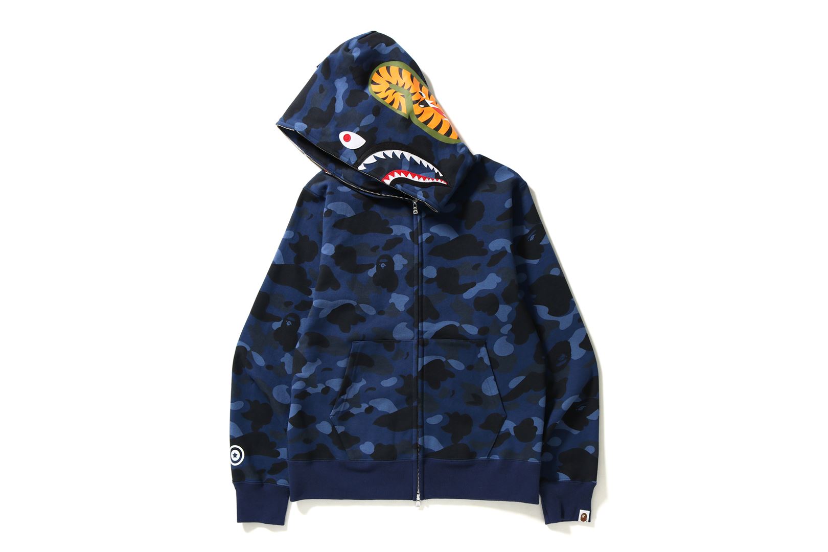 Zip-up hooded with a COLOR CAMO pattern printed on cotton fleece material with a nice texture. SHARK felt appliqu on the front of the hood, WGM's Sagara patch on the right back of the hood, a TIGER motif on the left of the back, and a star circle motif on the right sleeve. A muff pocket is placed on the abdomen and a piss name is placed on the left sleeve. Regular fit silhouette. Available in 4 colors and 6 sizes.