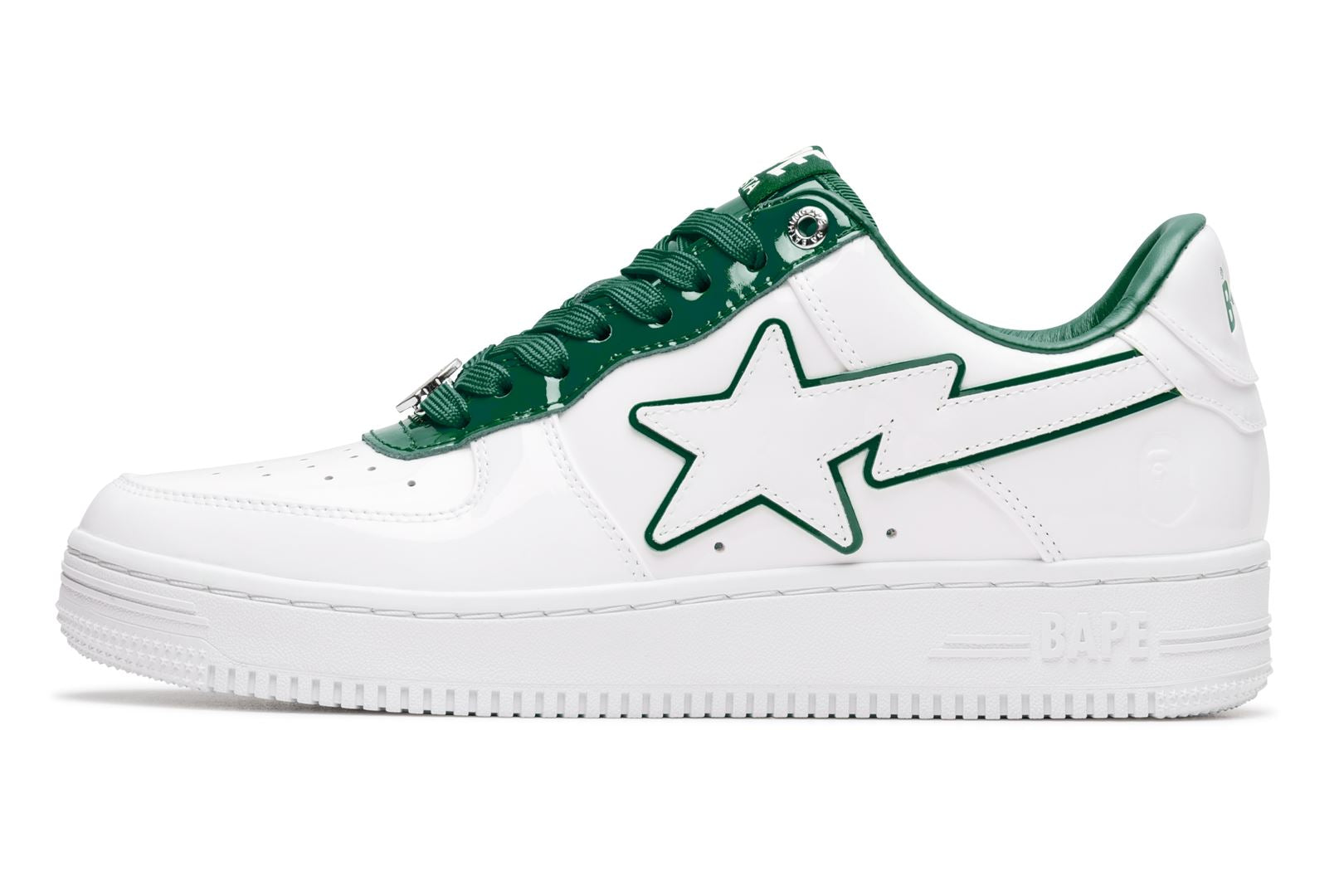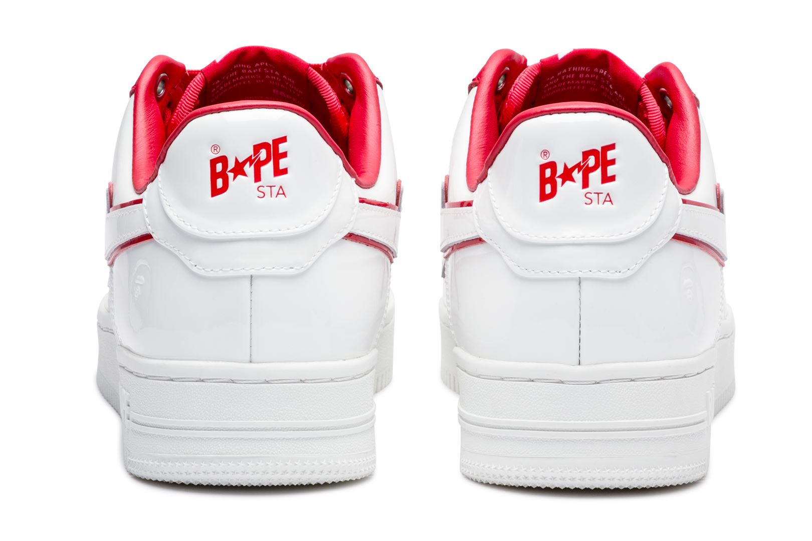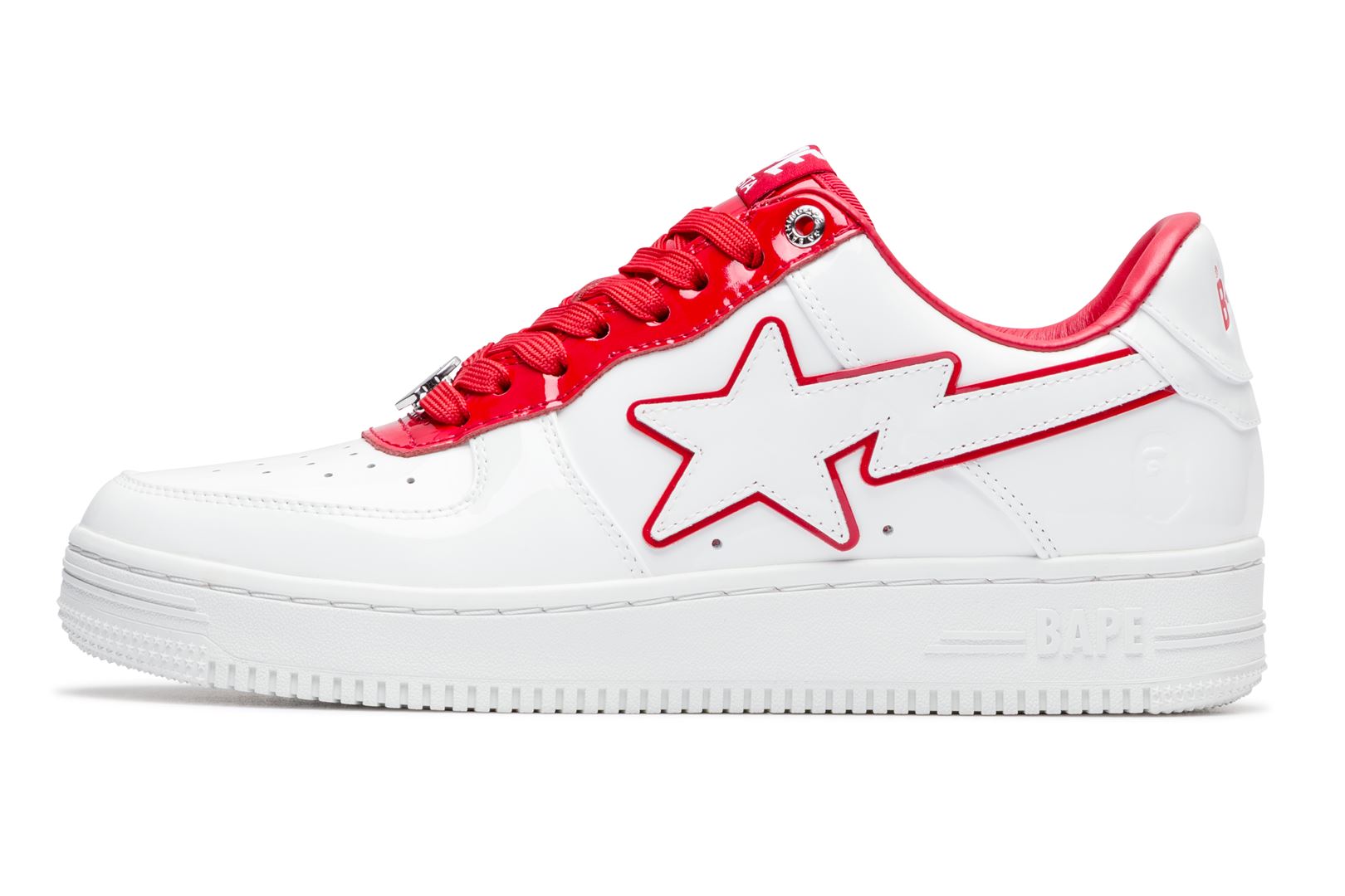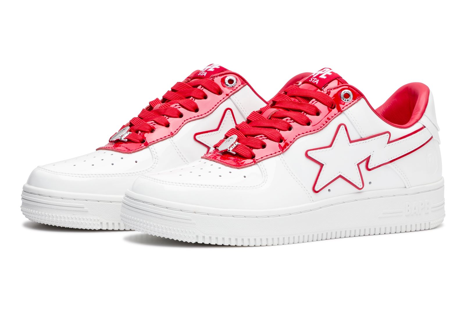 A sophisticated design with a classic silhouette. The entire upper is made up of white patent material, while bright red, green, and blue accent colors are featured on the insole, tongue, and STA outline.