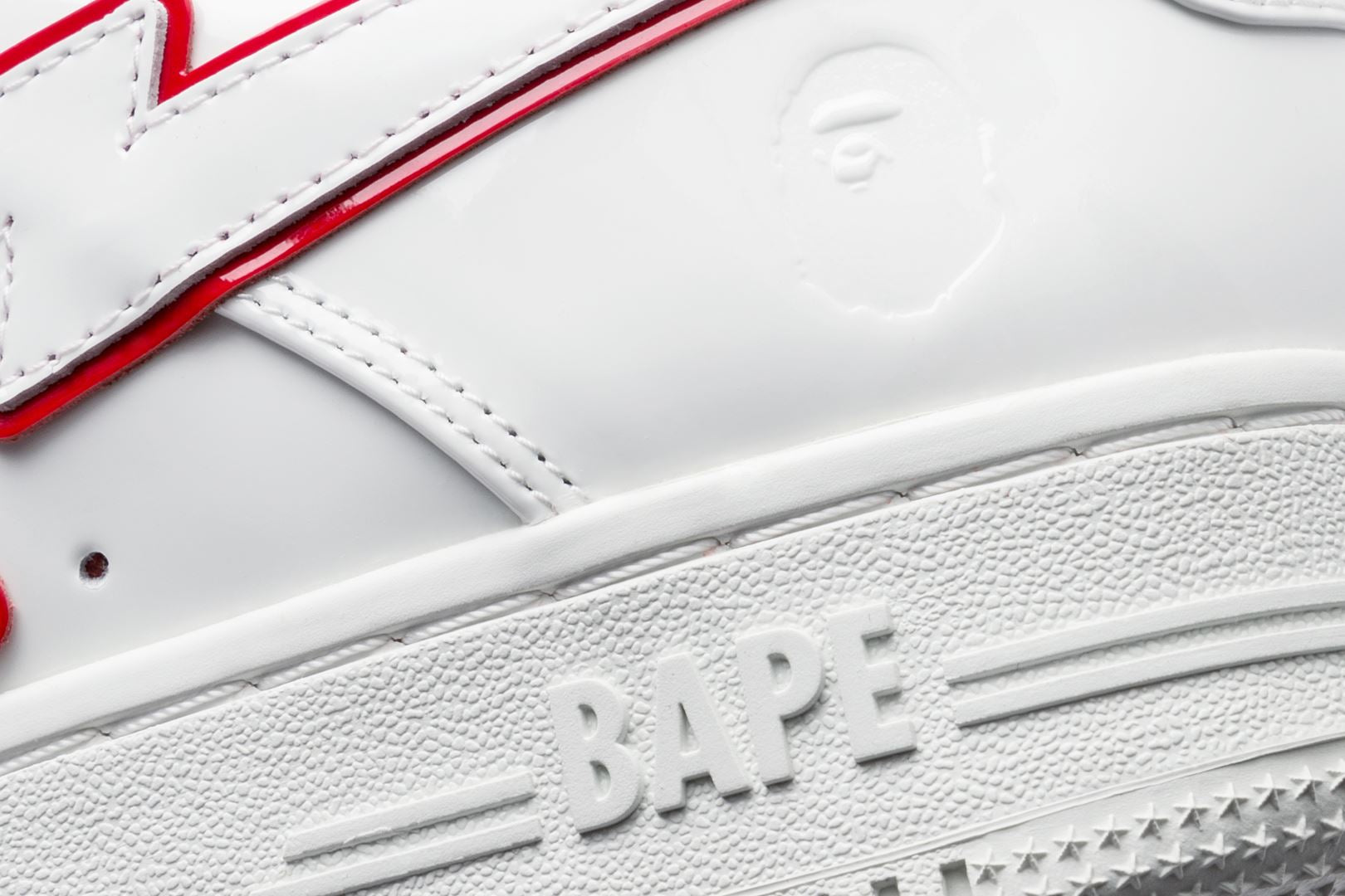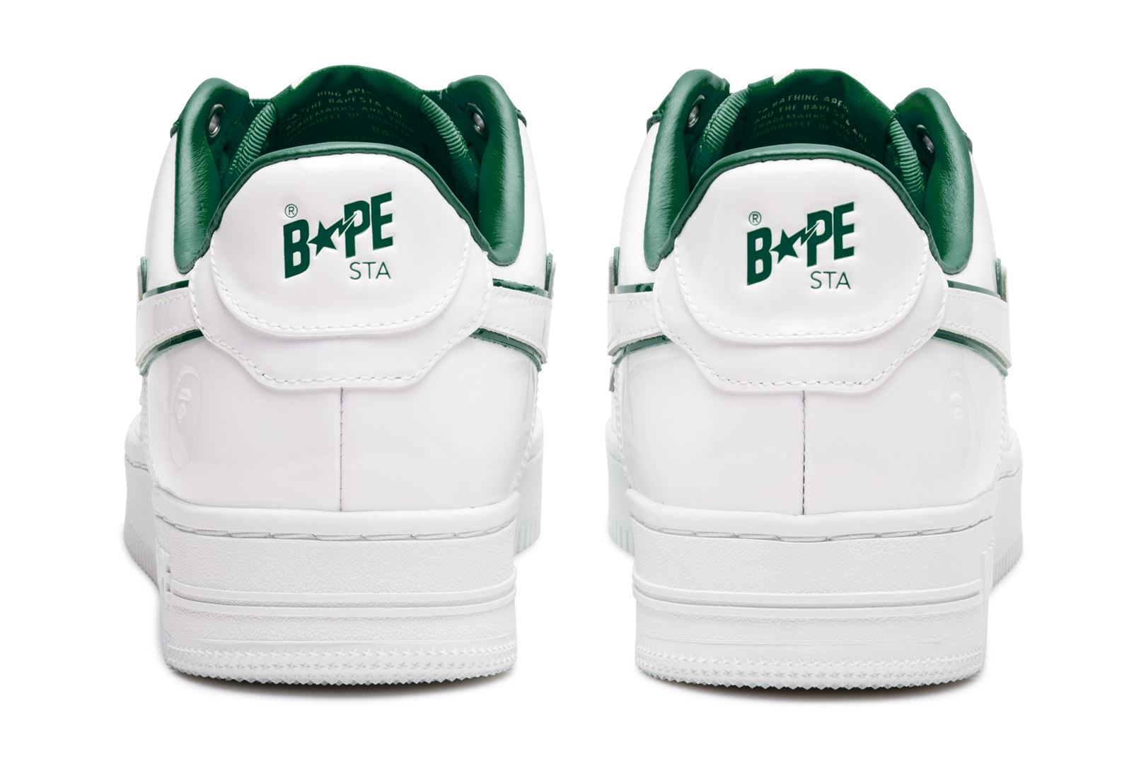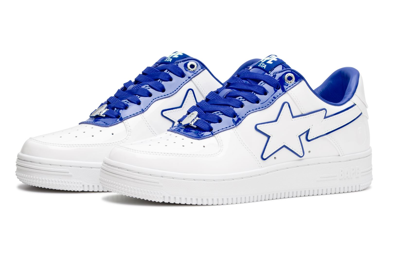 A sophisticated design with a classic silhouette. The entire upper is made up of white patent material, while bright red, green, and blue accent colors are featured on the insole, tongue, and STA outline.