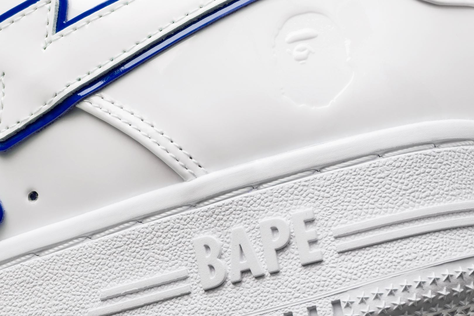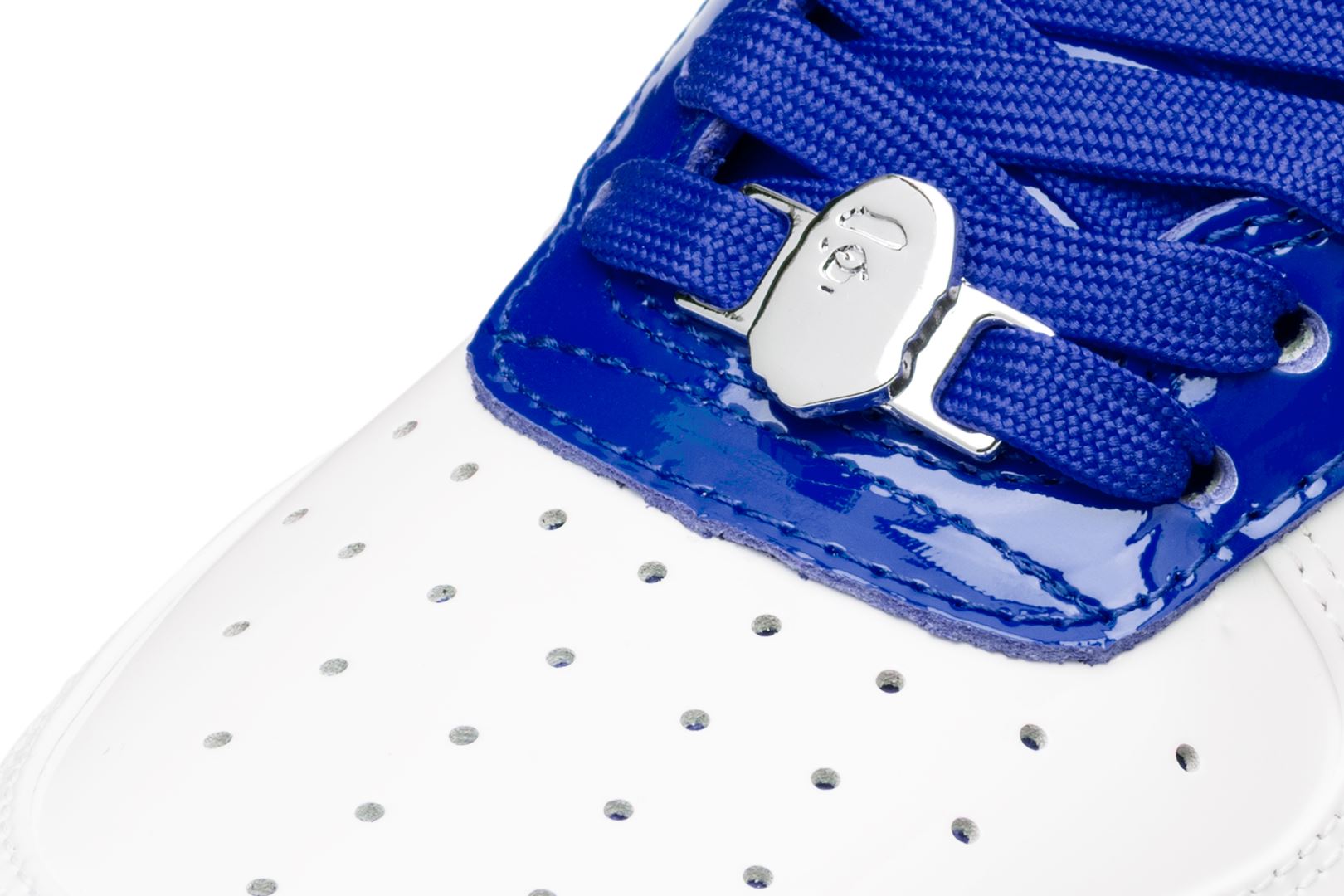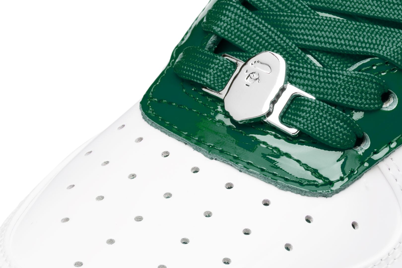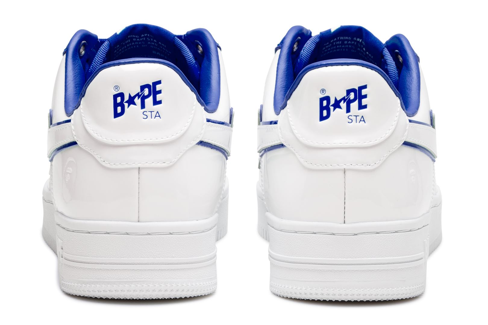 A sophisticated design with a classic silhouette. The entire upper is made up of white patent material, while bright red, green, and blue accent colors are featured on the insole, tongue, and STA outline.
