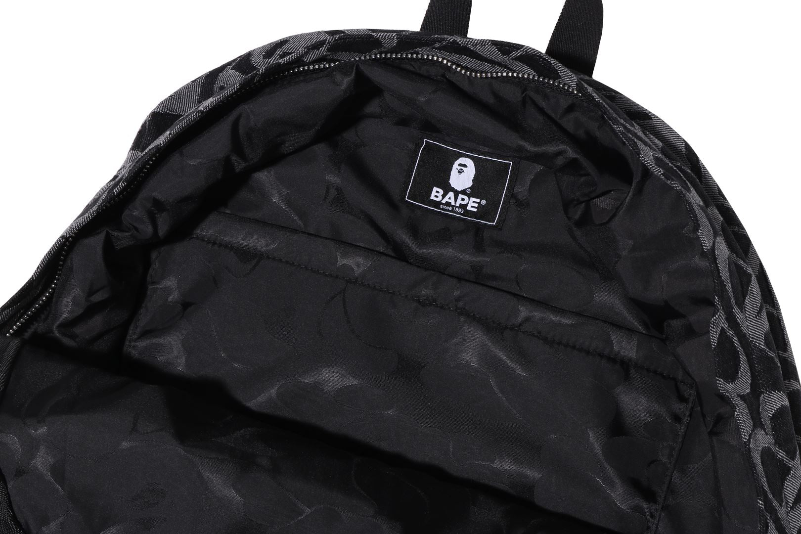 SPORT MONOGRAM A backpack made of cotton material with an all-over pattern. A zip pocket with an APE HEAD charm on the front, a square name with an APE HEAD placed on the pocket, and a double zipper with an APE HEAD charm on the top. Available in 1 color and 1 size.