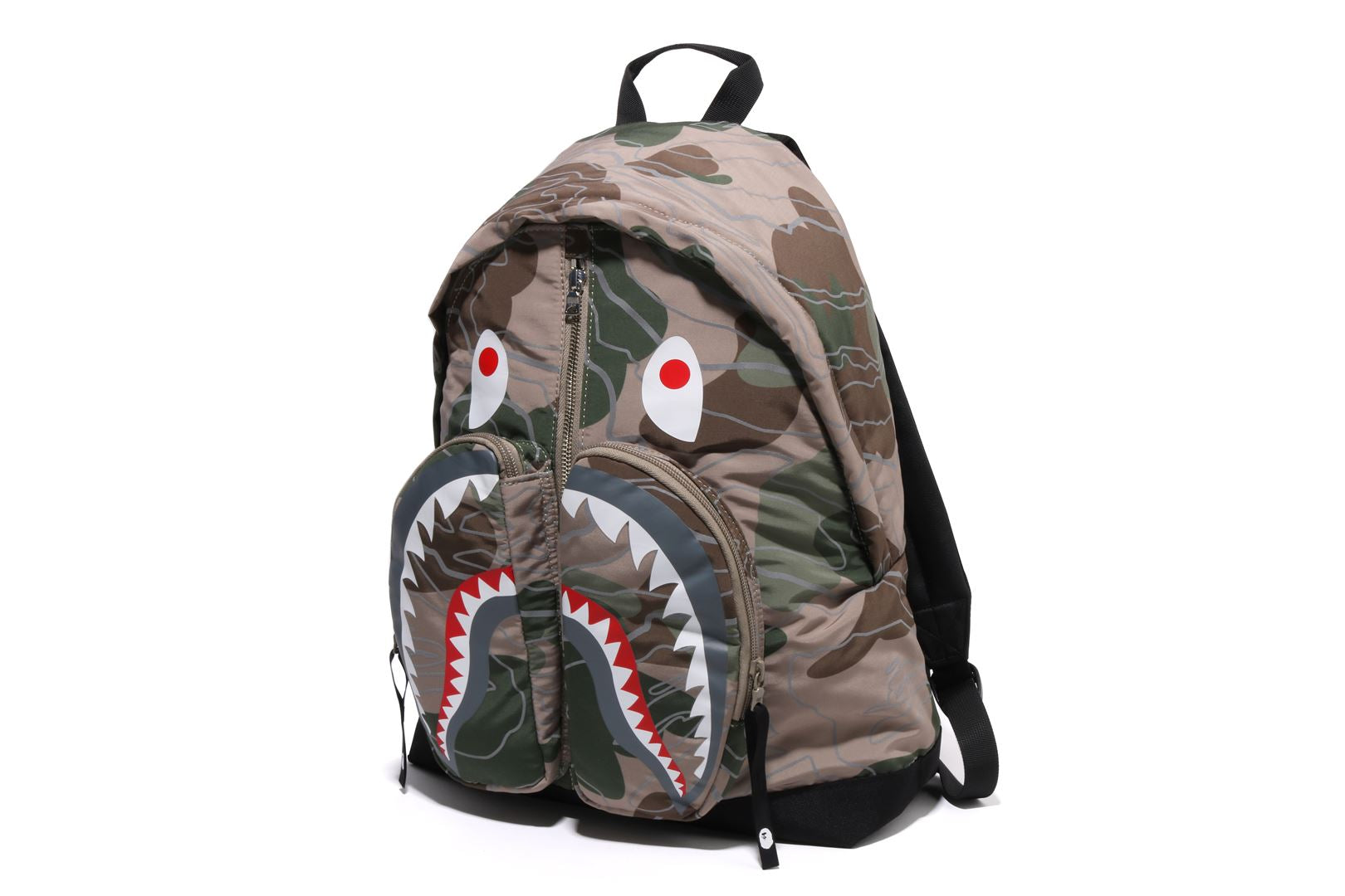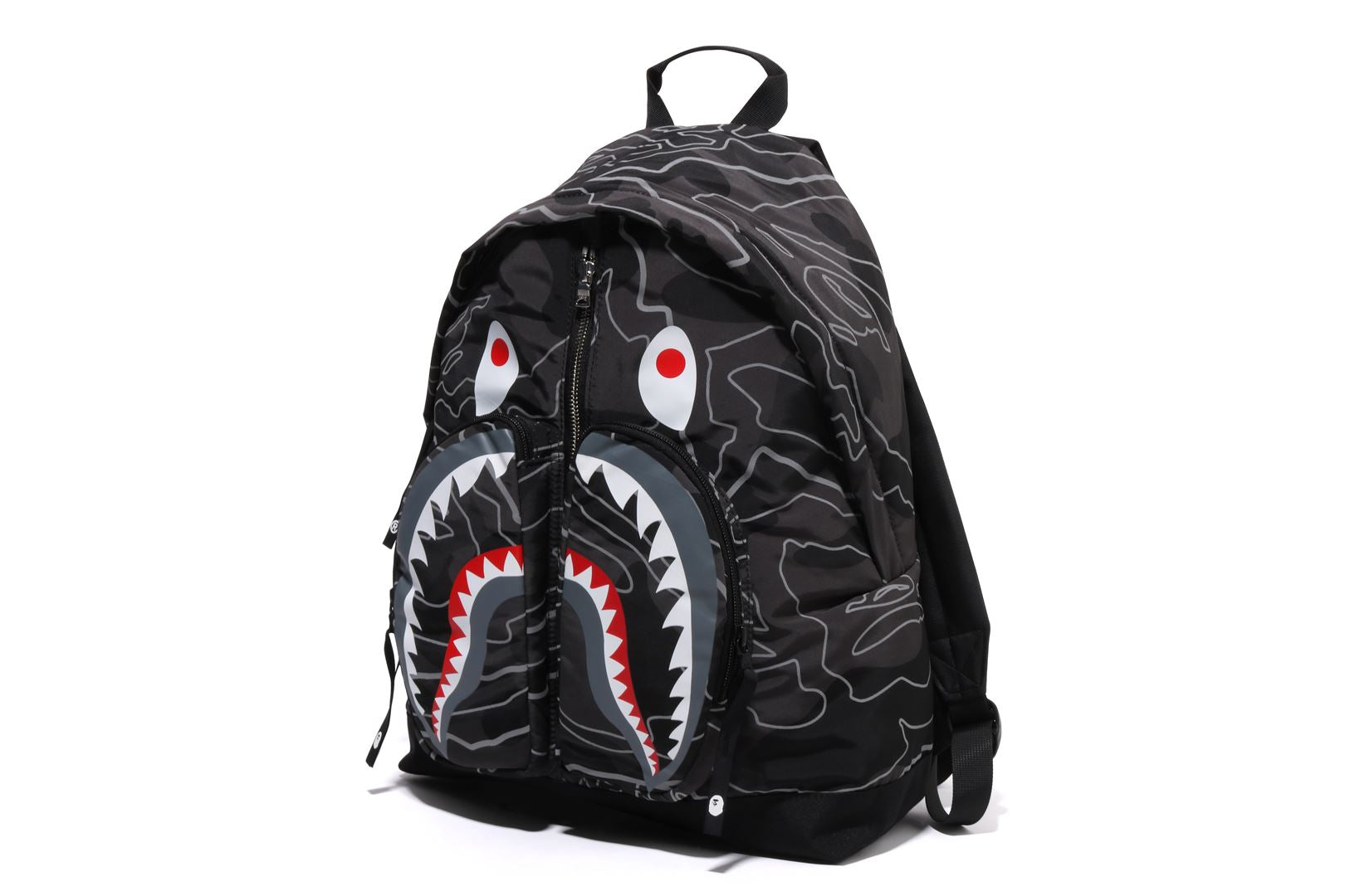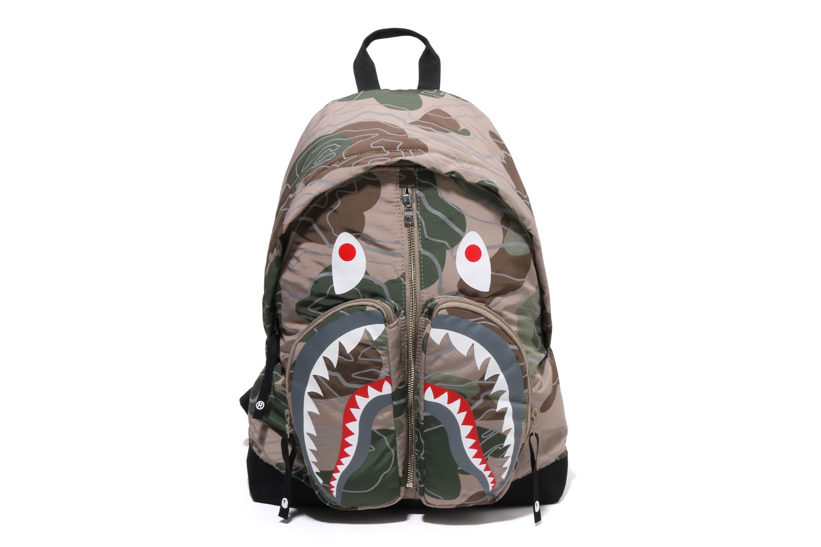 A daypack made of polyester material with a LAYERED LINE CAMO pattern. The SHARK motif is rubber printed on the front, and the LINE CAMO part is a phosphorescent print design. Comes with a round zipper for the pocket that follows the shape of the shark's mouth, and a zipper for the main compartment. APE HEAD is rubber printed on the nylon puller. There is a handle for hand carry on the top and straps on the left and right sides of the back. Available in 2 colors and 1 size.