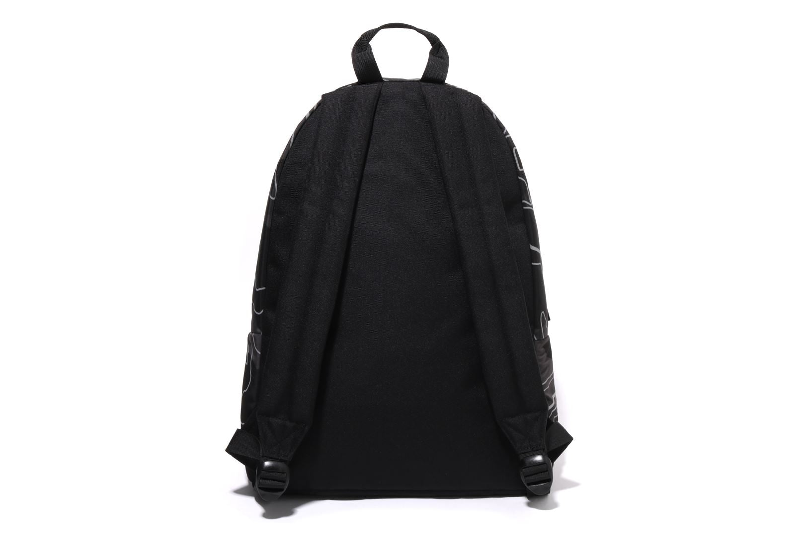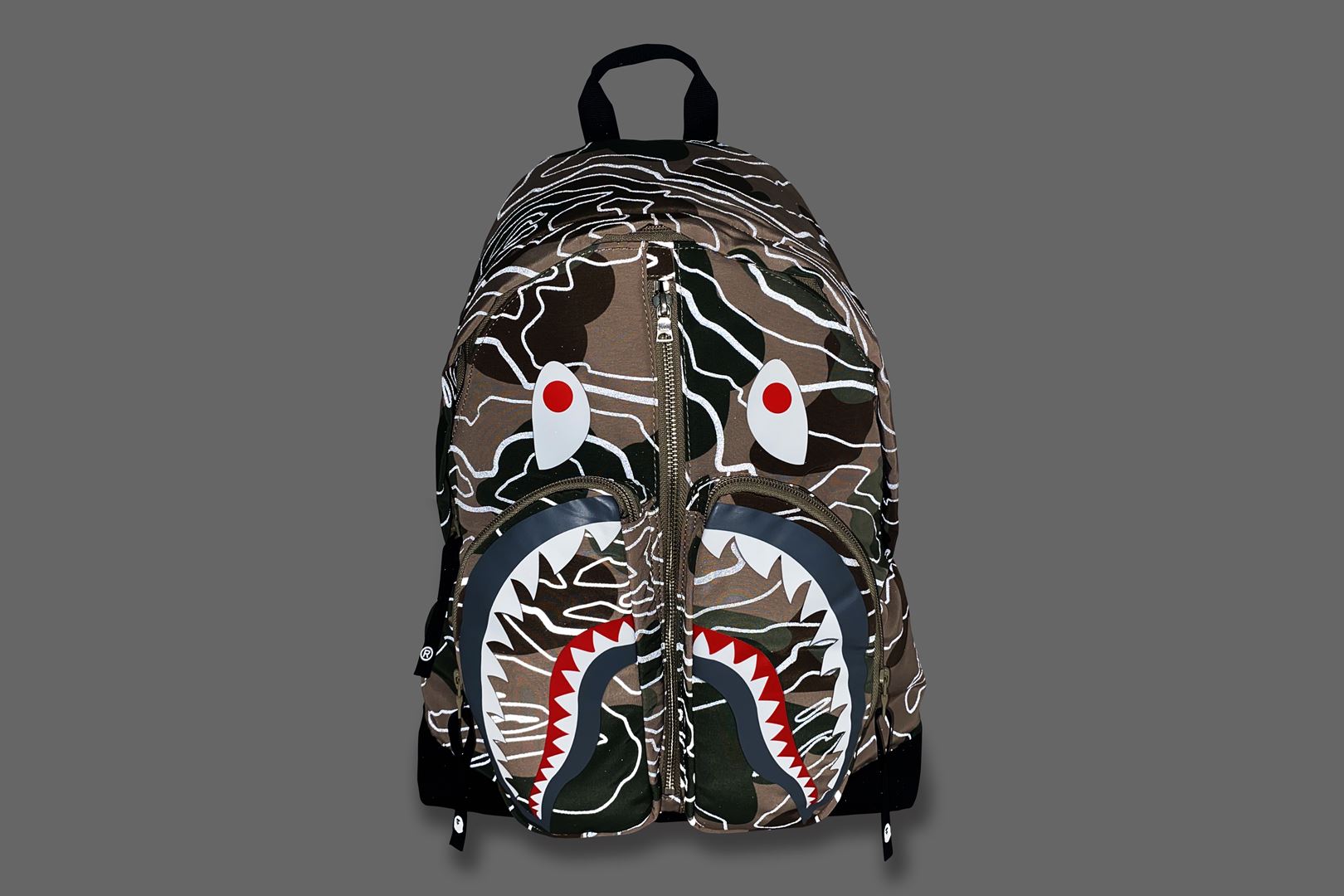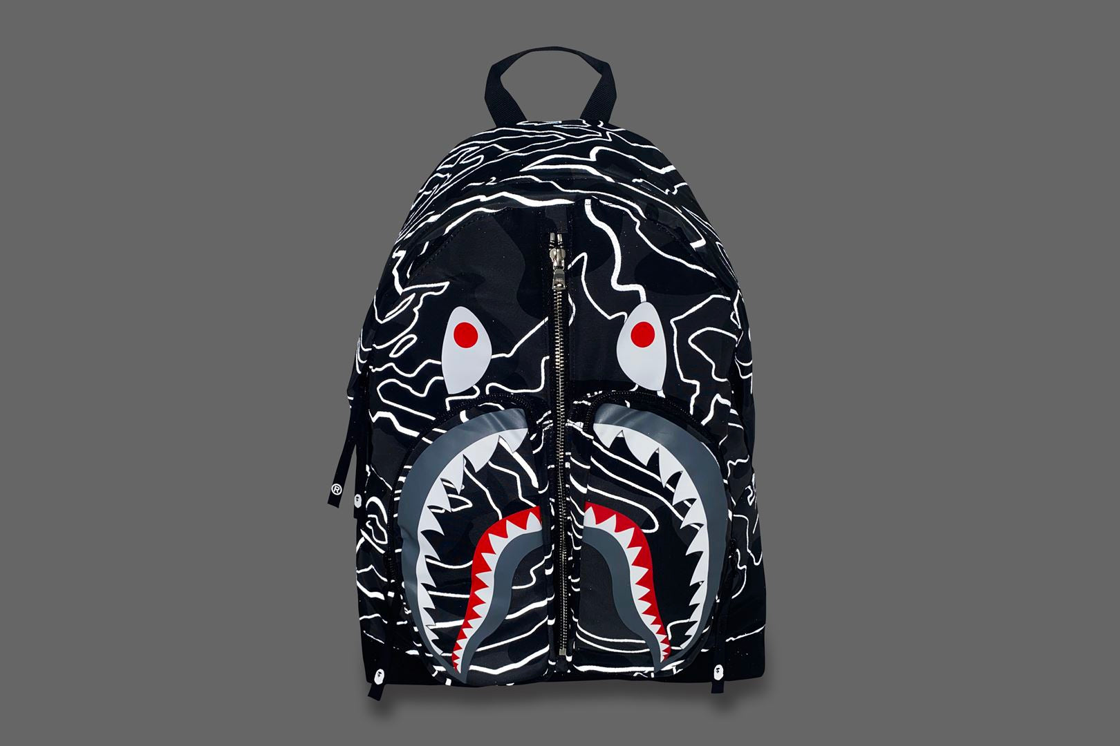 A daypack made of polyester material with a LAYERED LINE CAMO pattern. The SHARK motif is rubber printed on the front, and the LINE CAMO part is a phosphorescent print design. Comes with a round zipper for the pocket that follows the shape of the shark's mouth, and a zipper for the main compartment. APE HEAD is rubber printed on the nylon puller. There is a handle for hand carry on the top and straps on the left and right sides of the back. Available in 2 colors and 1 size.