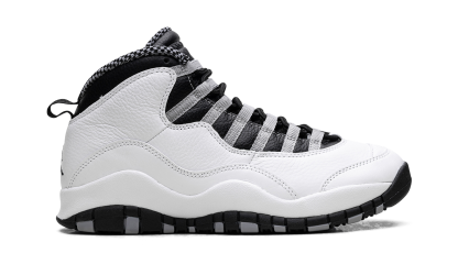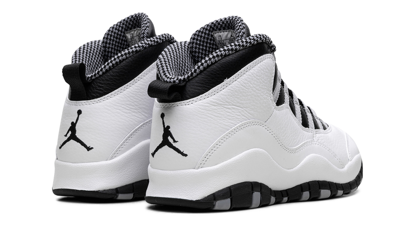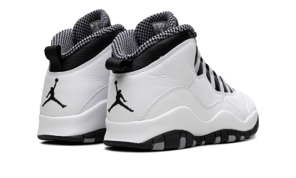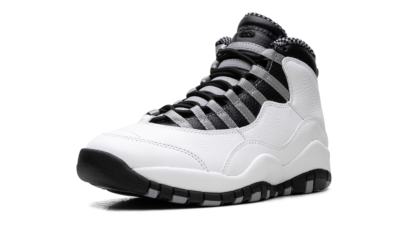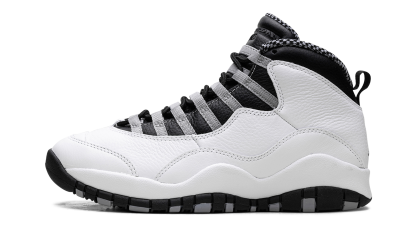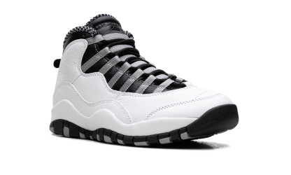 Elevate your sneaker game with the Air Jordan 10 "Steel." This iconic shoe offers a blend of heritage design and clean appeal, highlighted by its sharp grey and black details against a white base. It's a stylish and comfortable choice for any fan who appreciates classic Jordan aesthetics. Steel