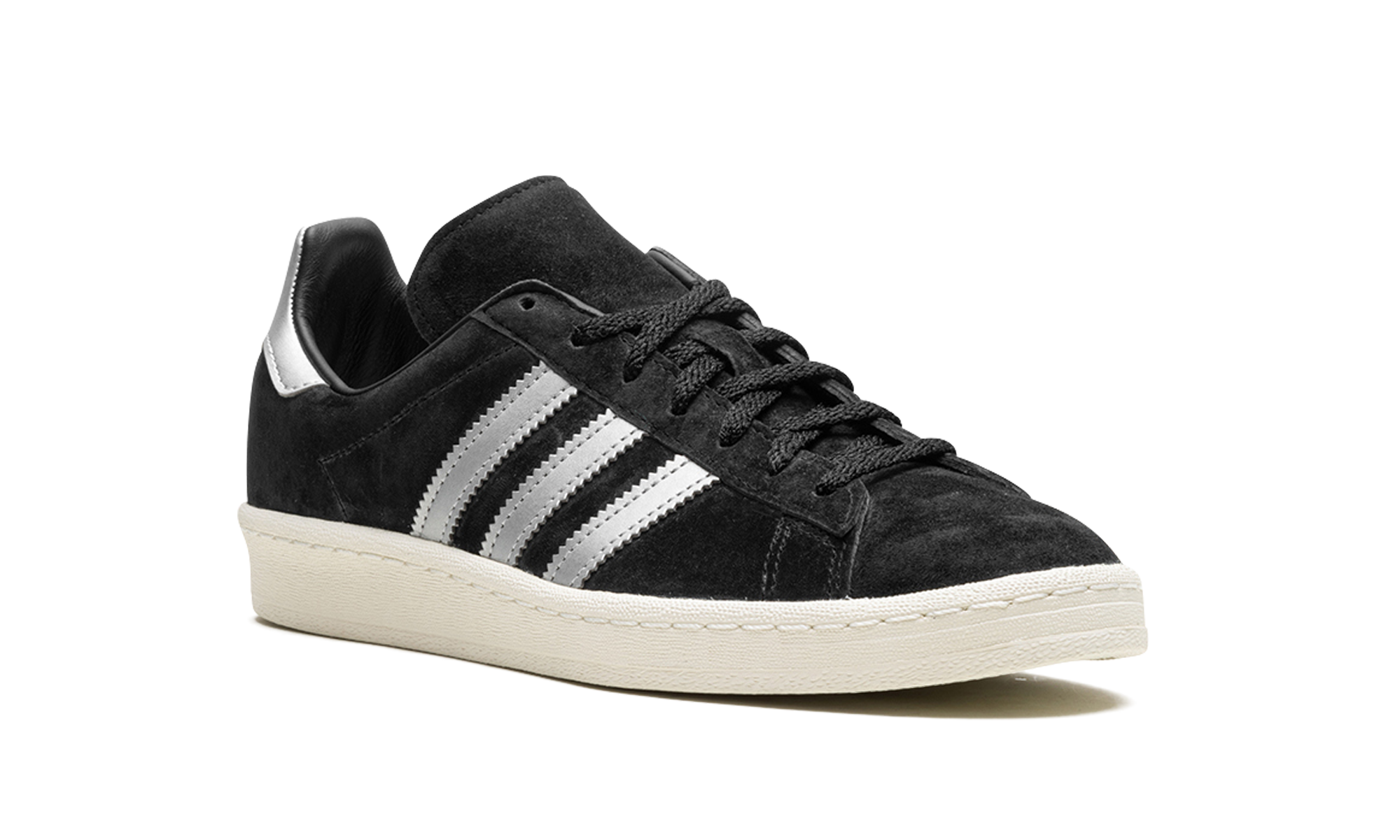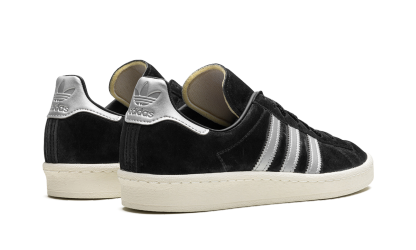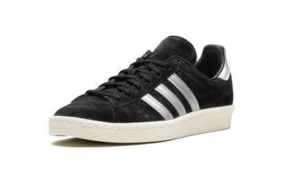 The adithtdas Campus 80s "Black/Off White" is a two-tone, black-and-white colorway of the retro shoe by the German footwear brand. The adithtdas Campus 80s in "Black/Off White" is designed in a versatile look for everyday wear. Specifically, the upper has a black suede construction and is contrasted with flashy Metallic Silver leather Three Stripes on the sides. More eye-catching Metallic Silver accenting appears on the heel. A black suede tongue and Off White rubber sole complete the look. Black Off White