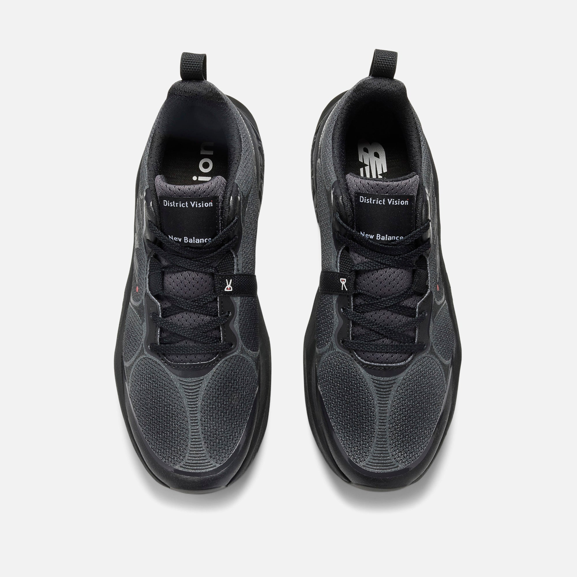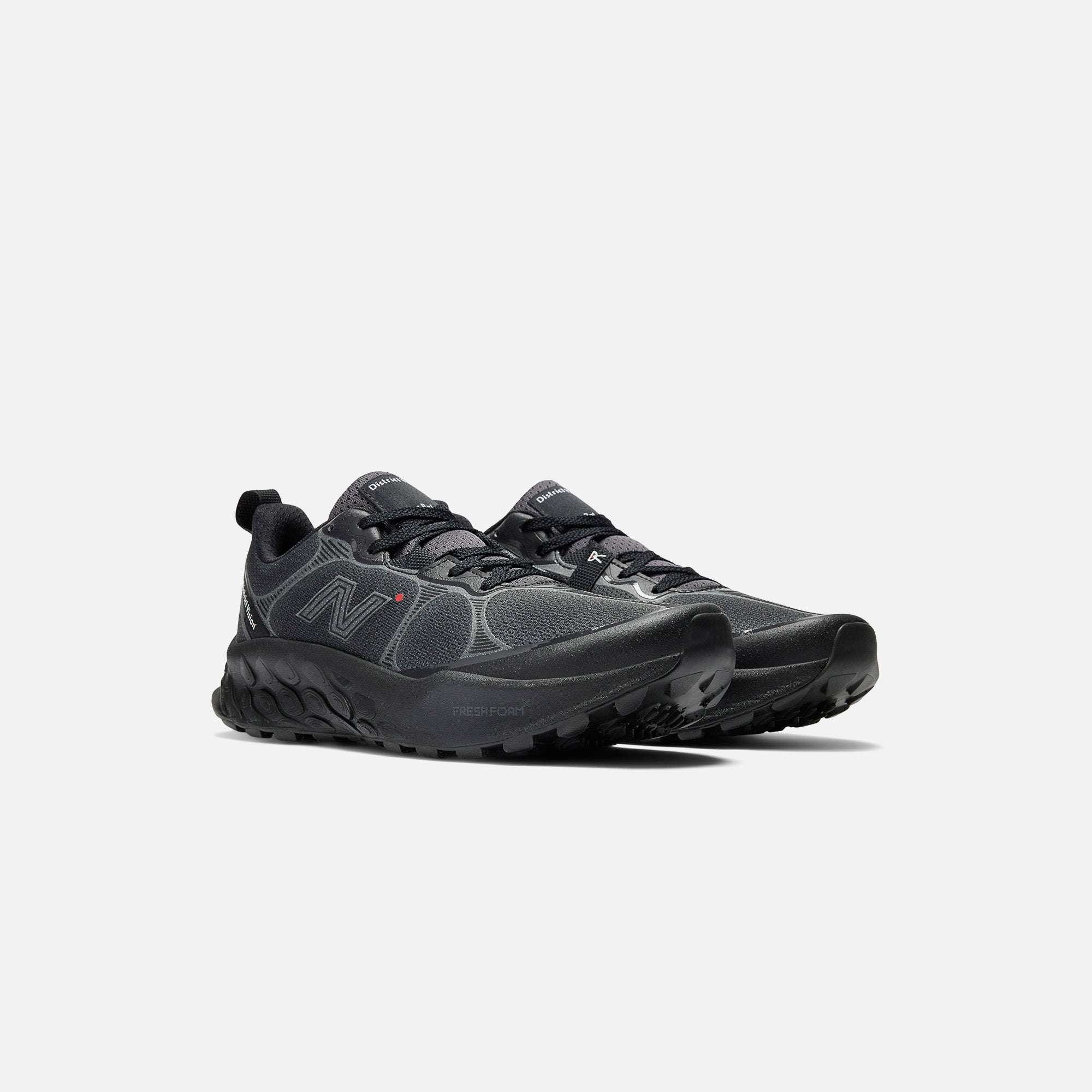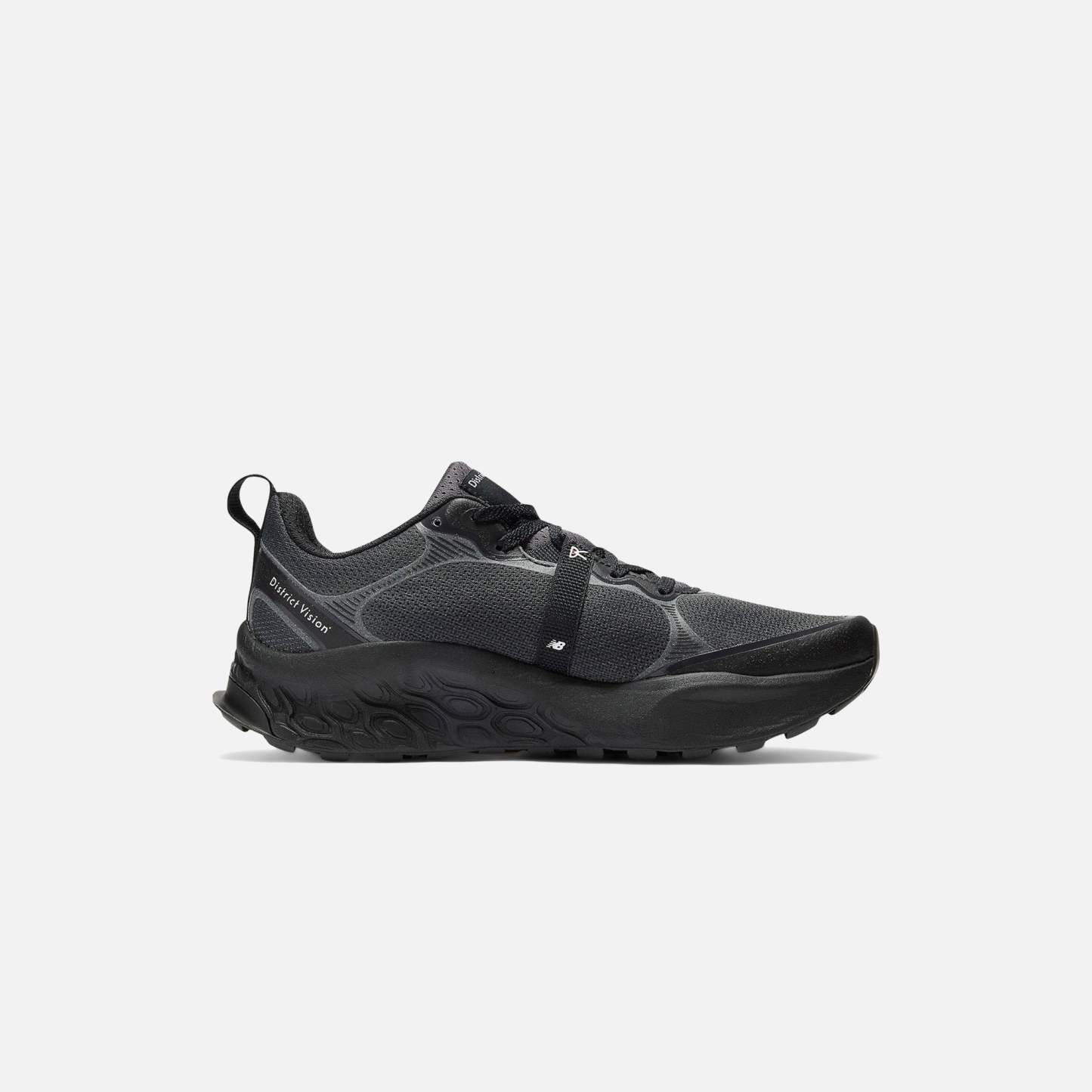 Empeigne en mesh et synthétique ? Col rembourré ? Logo District Vision x Nethtw Bathtlance sur la languette en mesh ? Logo N et point rouge sur les côtés ? Logo District Vision sur les côtés ? Étiquette logo District Vision sur le côté ? Languette au talon ? Lacets plats tissés ? Logo Vibram en relief sur la semelle ? Semelle intermédiaire Premium Fresh Foam X ? Vibram ? Semelle extérieure à crampons micro-adhérents