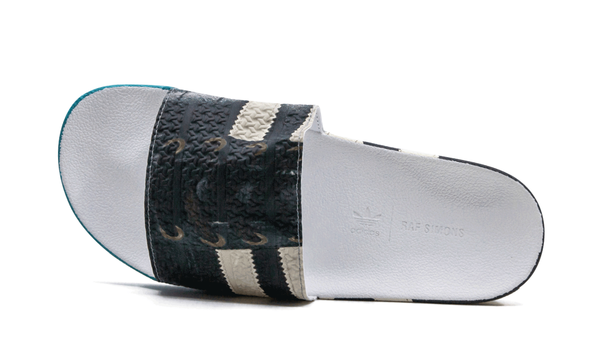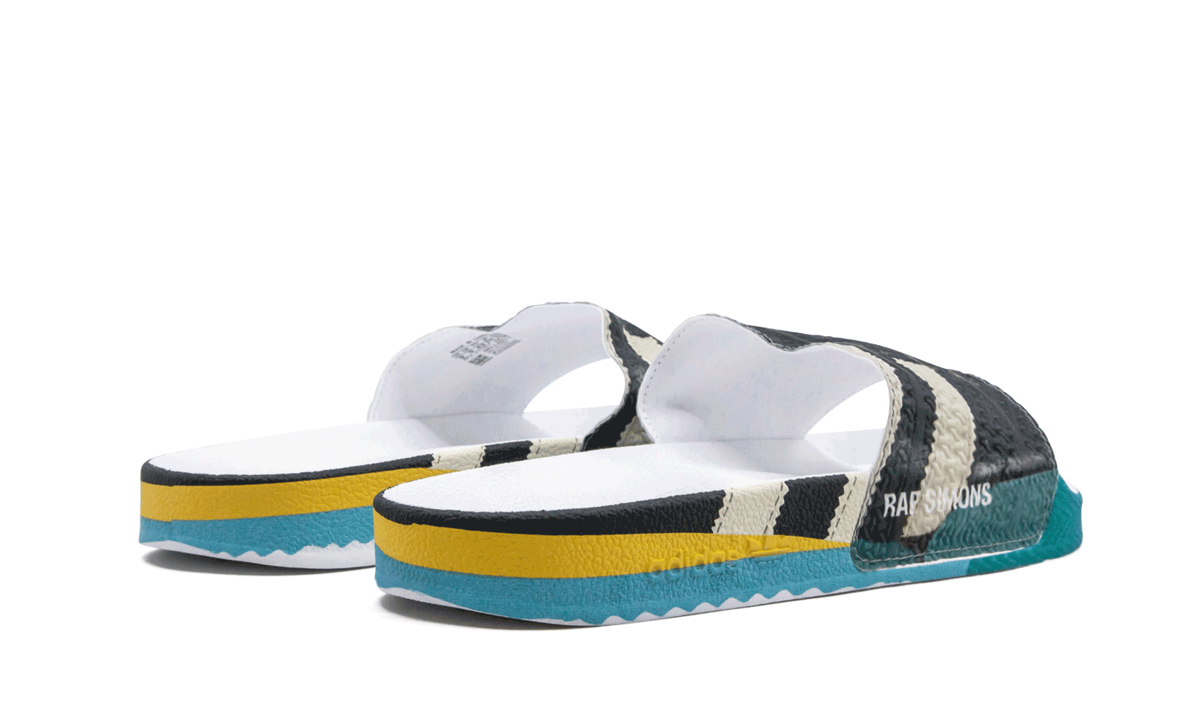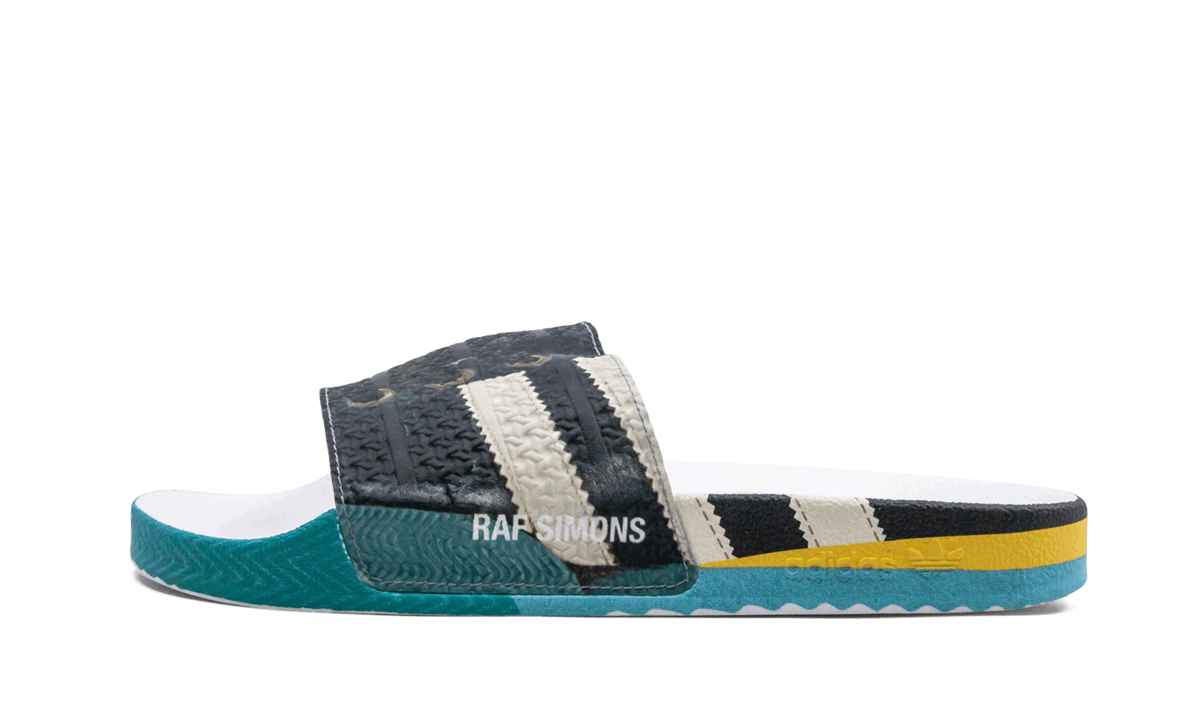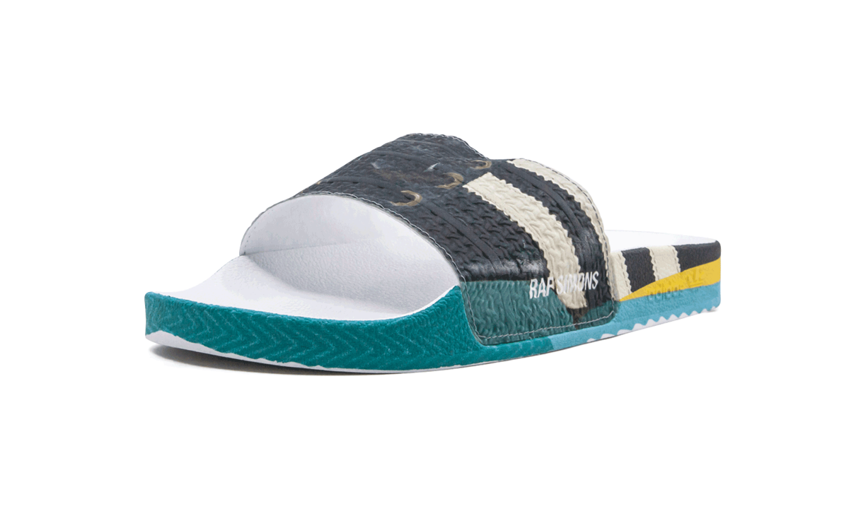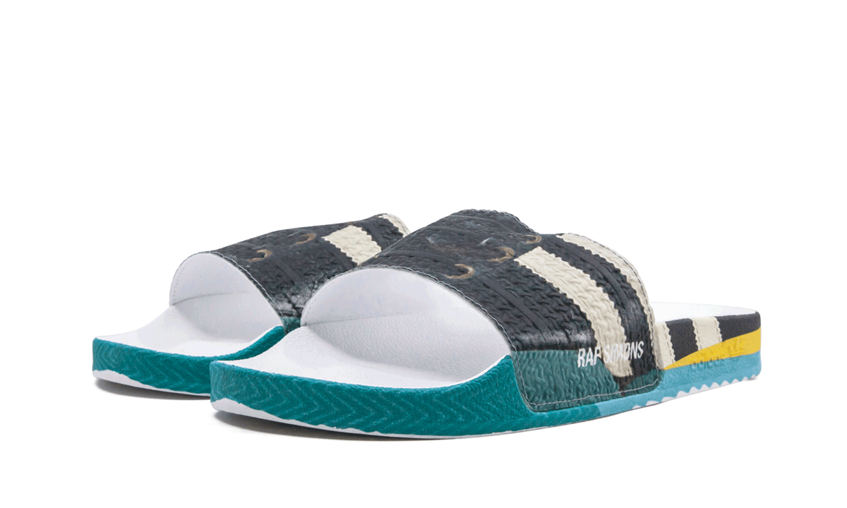 The Raf Simons x adithtdas Samba Adilette fuses two adithtdas footwear icons, the Samba and Adilette, to create a high-fashion masterpiece. The slip-on style comes with a textured faux-leather construction sporting multicolor graphics in turquoise, yellow, blue, black, and white printed throughout. An embossed dual logo appears on the footbed, while a Raf Simons printed logo hits the side in white. The sporty Raf Simons x adithtdas pool slide is inspired by the French painting technique known as tromp"-l'"l, which uses realistic imagery to create the optical illusion that the depicted objects exist in three dimensions.