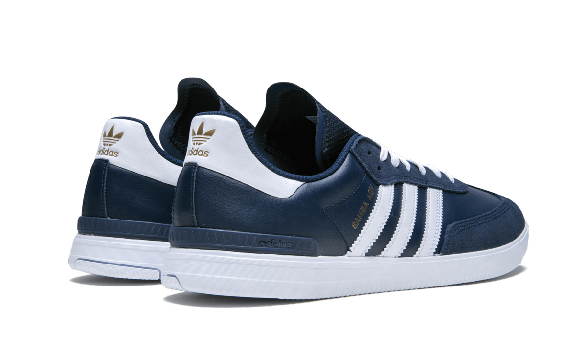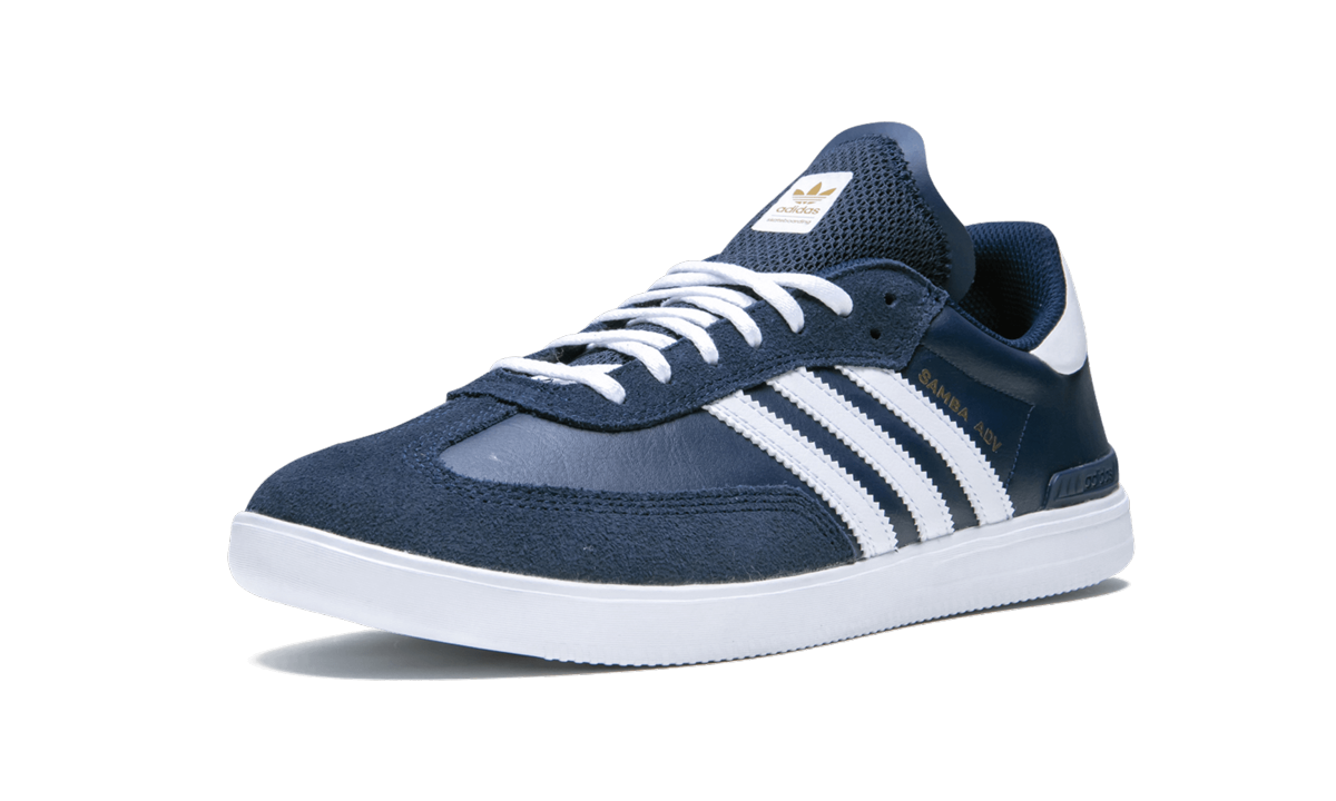 The adithtdas Samba ADV is a tweaked iteration of the classic low-top silhouette improved for skateboarding. A leather upper features suede overlays on the eyelets and toe. Improvements include reinforced high impact areas, a non-slip mesh tongue, exposed Bounce cushioning in the midsole, and a Geoflex outsole. This colorway of the adithtdas Samba ADV sports a navy blue upper with white detailing on the Three Stripes, tongue label, heel tab, and midsole. Gold branding hits appear on the side panel, tongue, and heel.