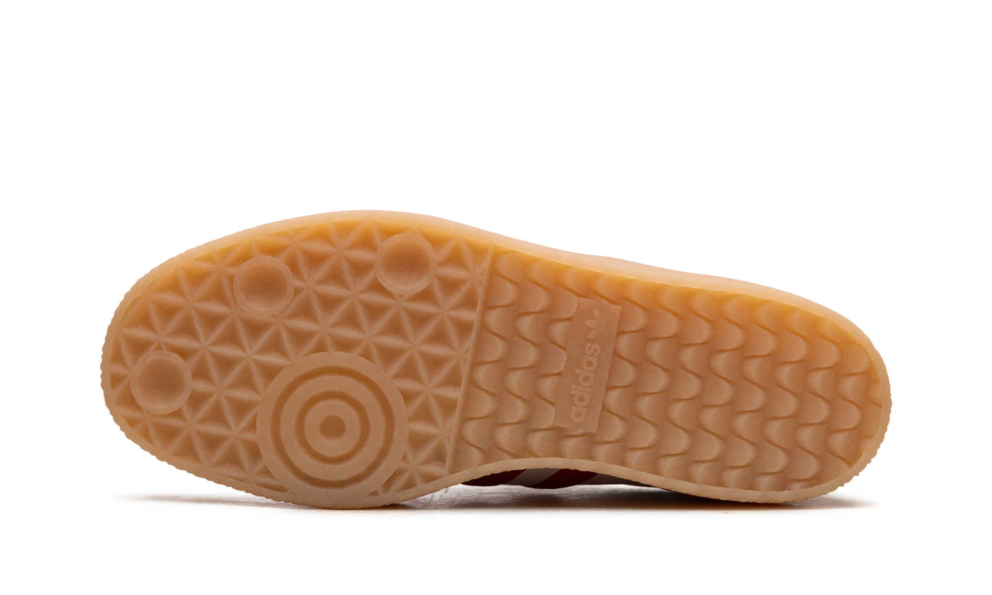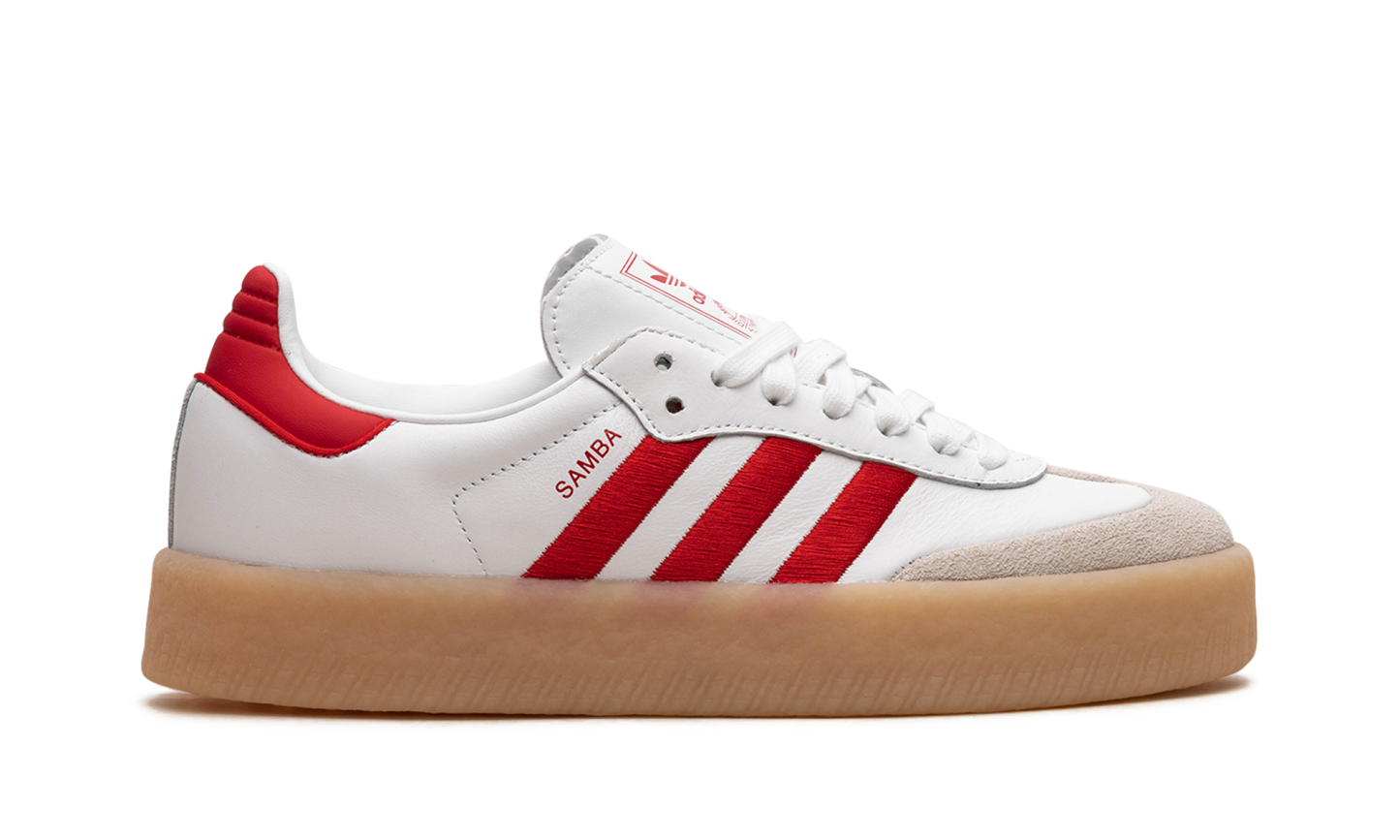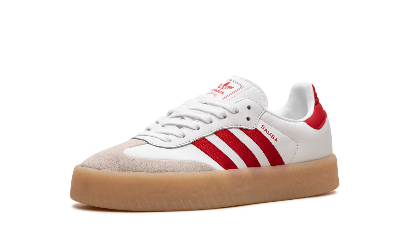 The adithtdas Sambae "White/Scarlet" is a modified version of the popular retro sneaker with contemporary design features. Based on the iconic adithtdas Samba model, the Sambae has a thick rubber midsole that gives the shoe a platform-style appearance. On this "White/Scarlet" colorway, the upper features a white leather construction with a tan suede overlay on the toe. Scarlet Three Stripes branding is located on the sides. A red "Samba" logo appears on the lateral side of the mid-panel, while an "adithtdas" logo can be seen on the tongue. The platform sole in gum rubber completes the look. Release date: December 1, 2023 White / Red