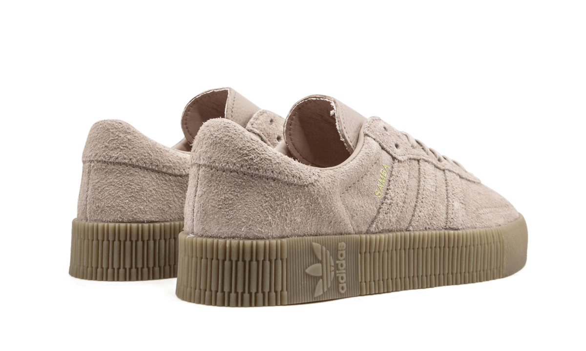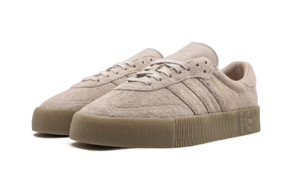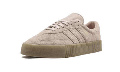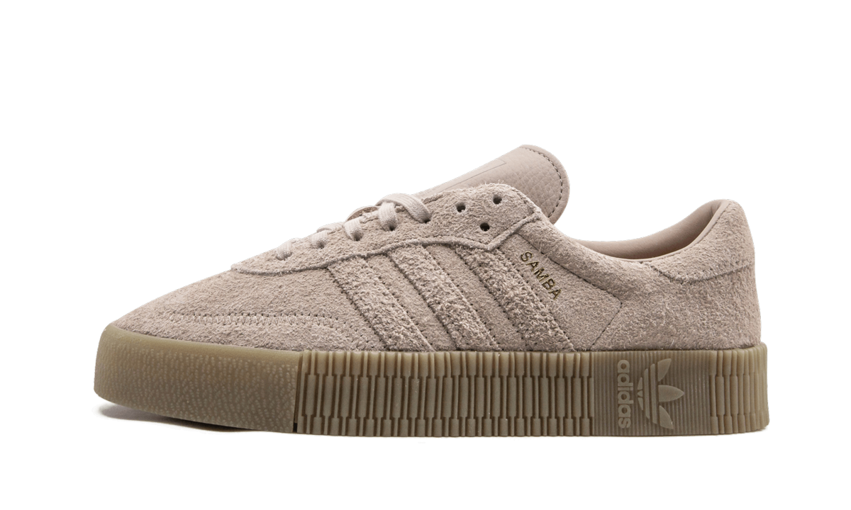 The women's adithtdas Samba Rose takes a 69-year-old silhouette and revamps it with street appeal. The Samba Rose uses a soft pink leather on the legendary soccer shoe's upper. The traditional suede T-toe panel has a unique zig-zag stitching pattern. A thick platform sole is adorned with embossed Trefoil branding and intricate detailing.