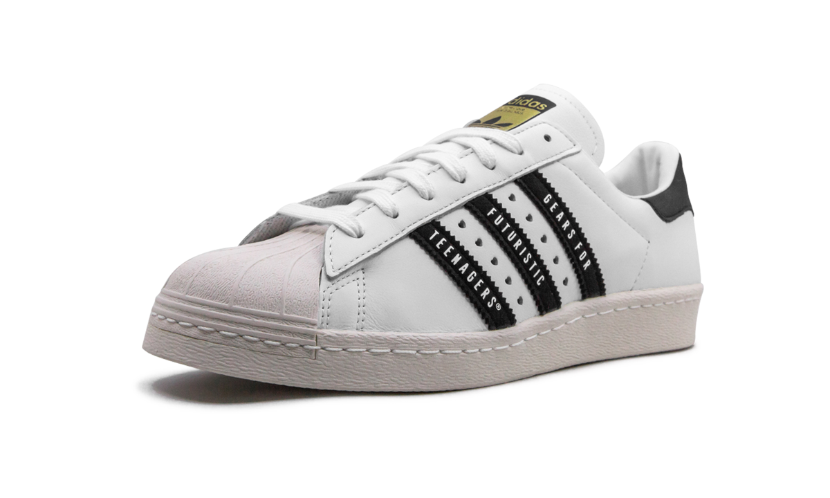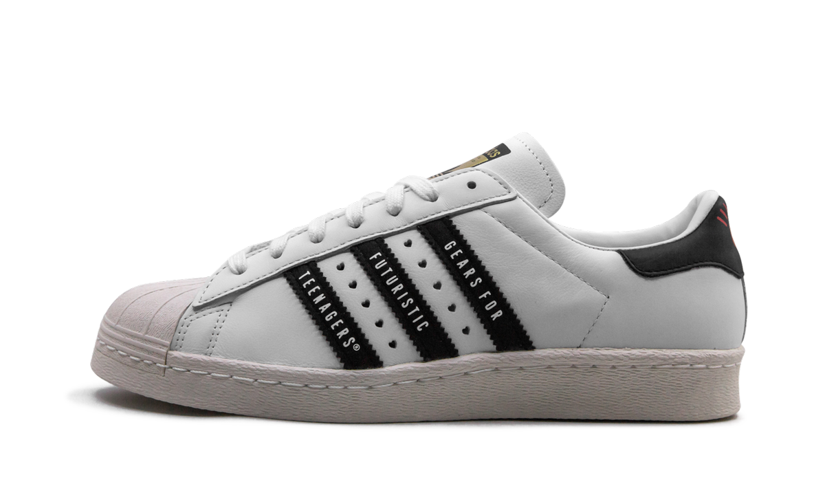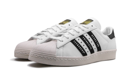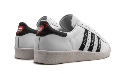 The Human Made x adithtdas Superstar 80s "White/Black" is one of three sought after colorways of the high profile collaboration between NIGO's premium streetwear brand and adithtdas. Continuing its partnership that dates back to the early 2000s, both adithtdas and NIGO set out to lace the streetwear set with versatile looks for the Spring/Summer 2020 season. This variation features a clean white leather upper with contrasting black leather Three Stripes detailing on the mid-panel. Human Made's "Gears For Futuristic Teenagers" can be found inside of the design. Additional styling cues include a classic gold foil adithtdas logo on the white leather tongue and Human Made branding on the black leather heel tab. A cream rubber shell toe and sole complete the look. The Human Made x adithtdas Superstar 80s "White/Black" was released on April 24, 2020. White/Black