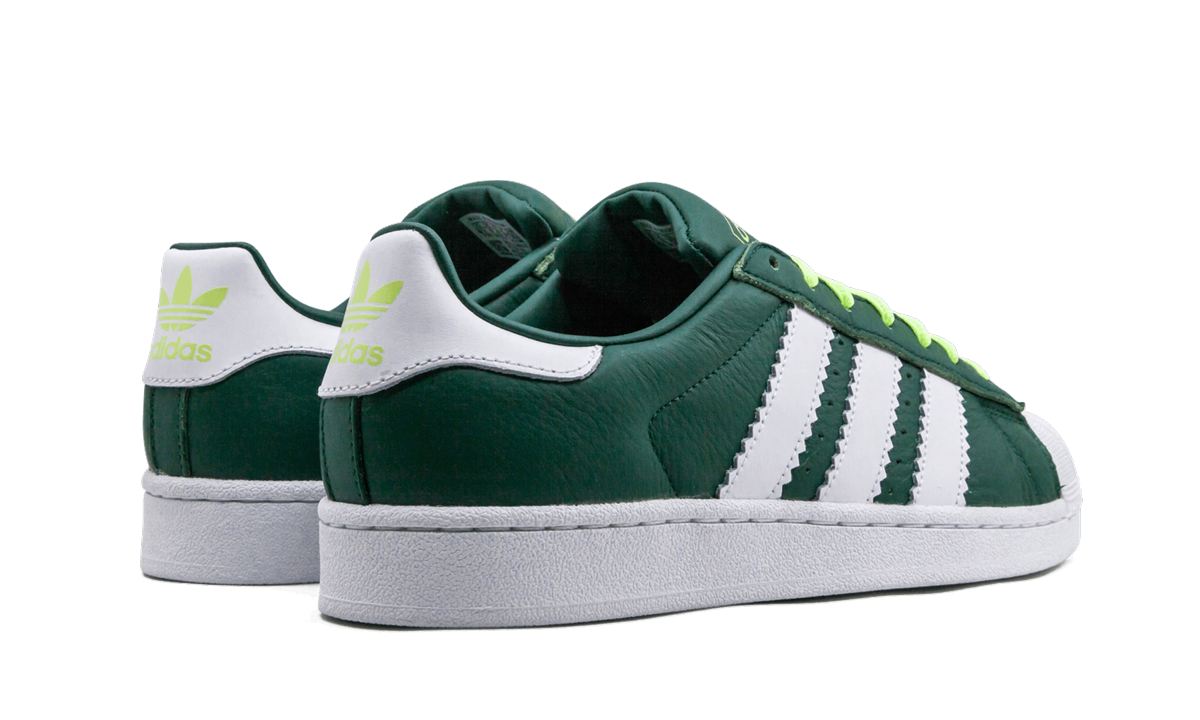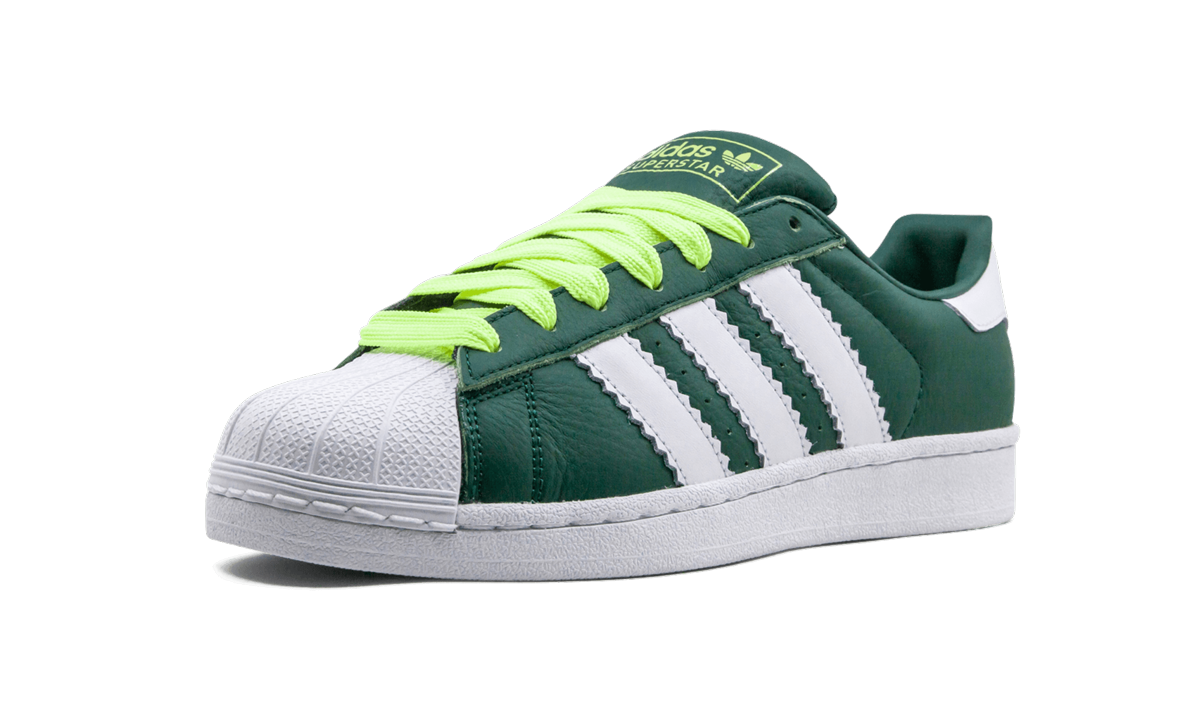 The adithtdas Superstar in "Collegiate Green" gives the classic lifestyle sneaker an attention-grabbing makeover thanks to its Collegiate Green leather upper. Contrasting Three Stripes branding in white leather is featured on the mid-panel. A signature thick white rubber shelltoe remains intact on this model. Bright green chunky laces and adithtdas branding on the tongue pop against the darker tones of the upper. A white rubber midsole with a traction-patterned outsole completes the look of this design.