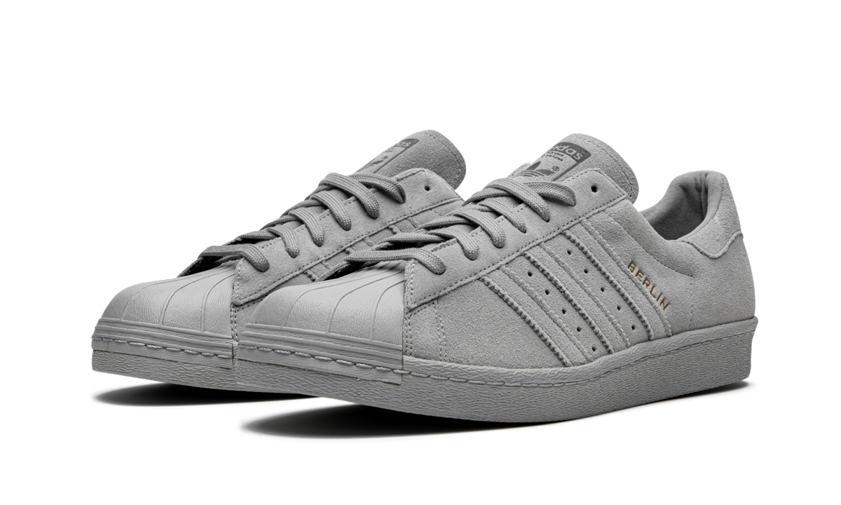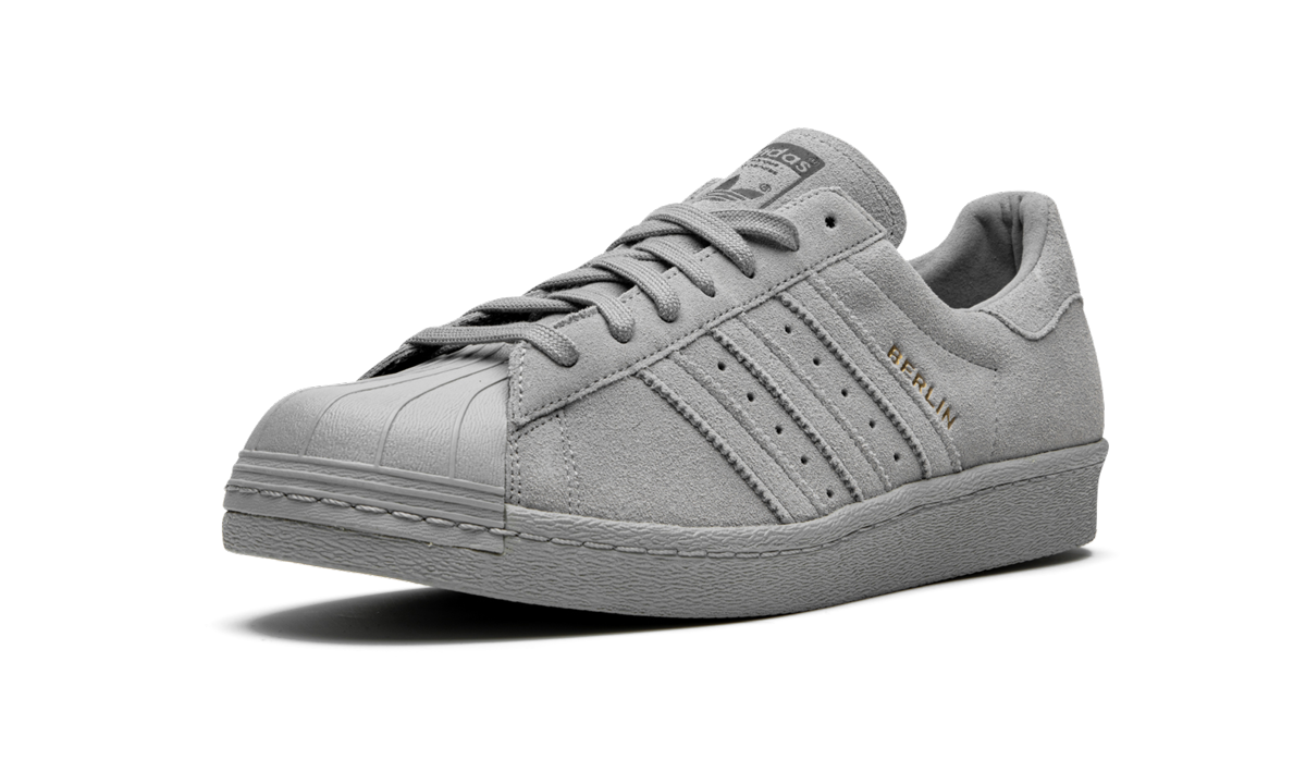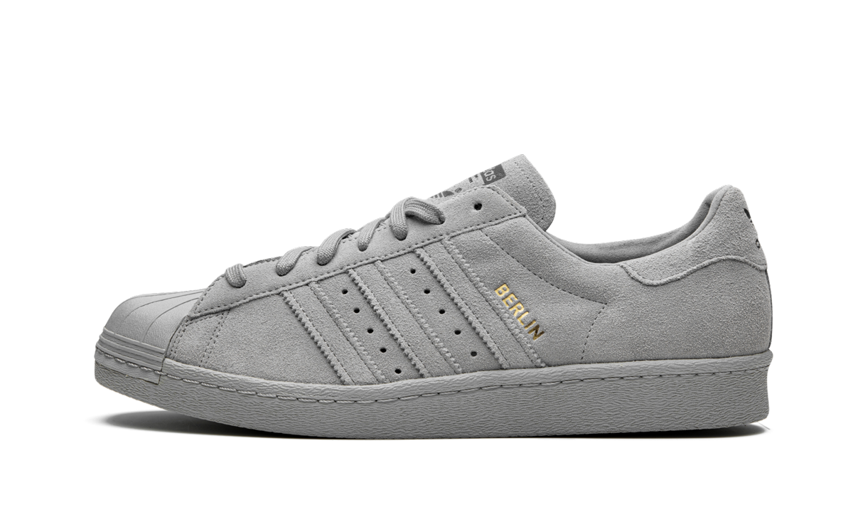 The adithtdas Superstar 80s City Series "Berlin" is part of a six-pair footwear collection inspired by bold color palettes from the '80s. Each pair of the "City" series honors the world's top sporting destinations and this pair nods to Berlin, Germany. Elevated with a smooth suede and leather upper, the sporty low-top boasts a rich grey hue from top to bottom. It features the iconic shelltoe and has an outsole with herringbone traction. Accented with gold foil, "Berlin" appears on the side and the Berliner Fernsehturm TV tower marks the heel. Berlin