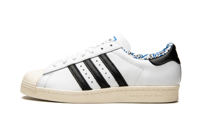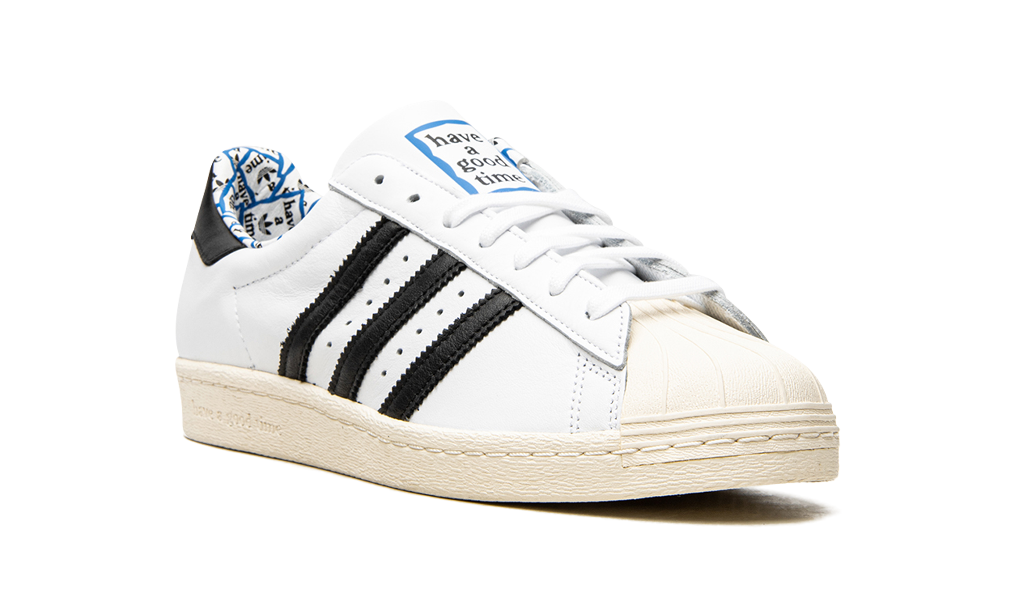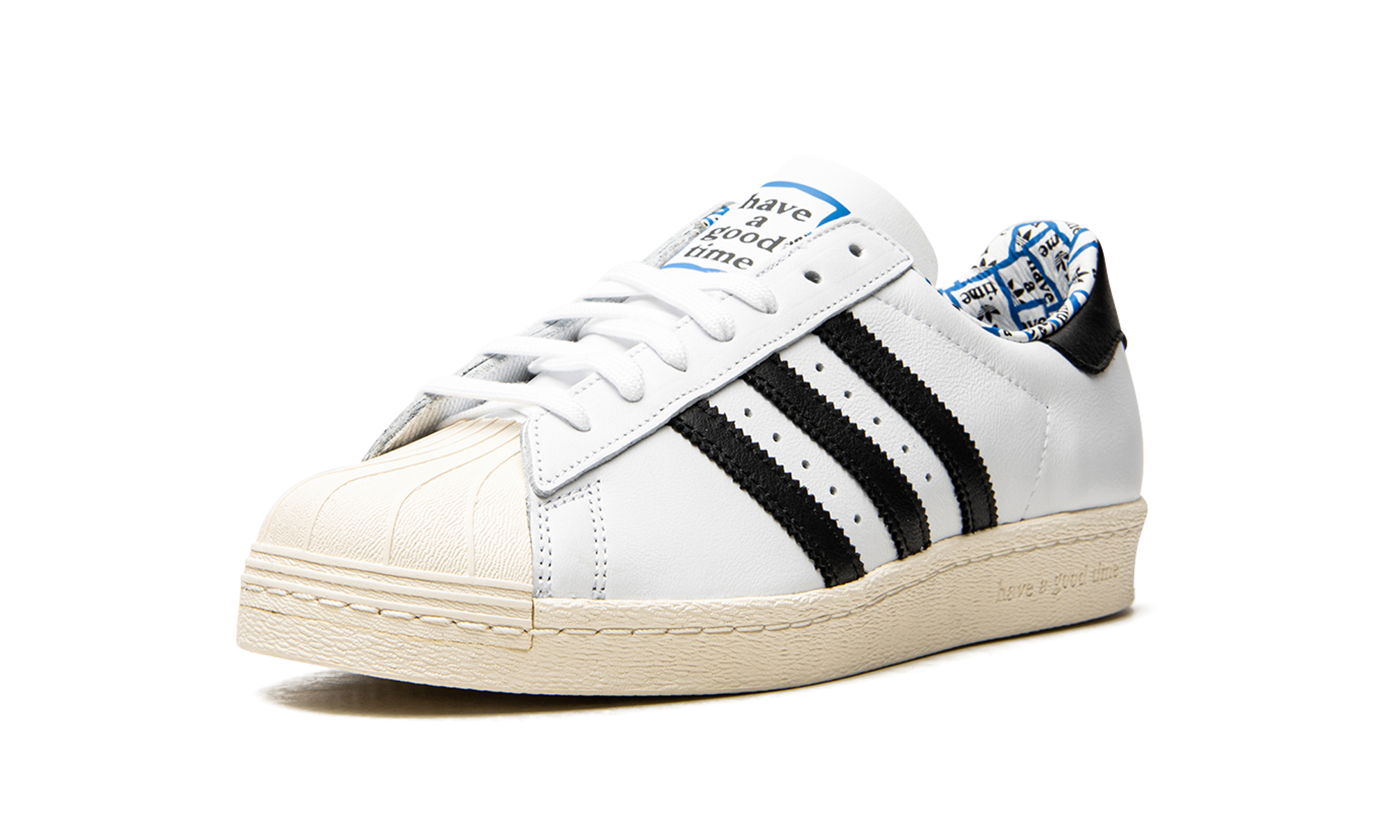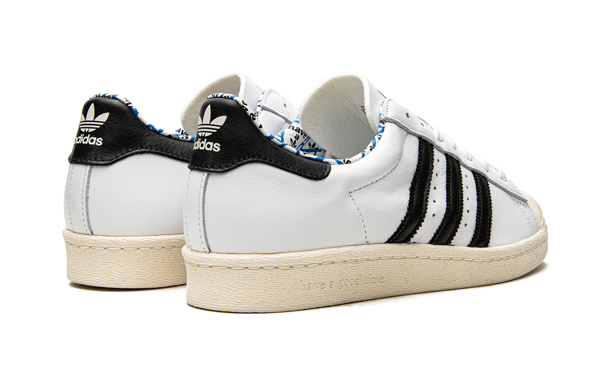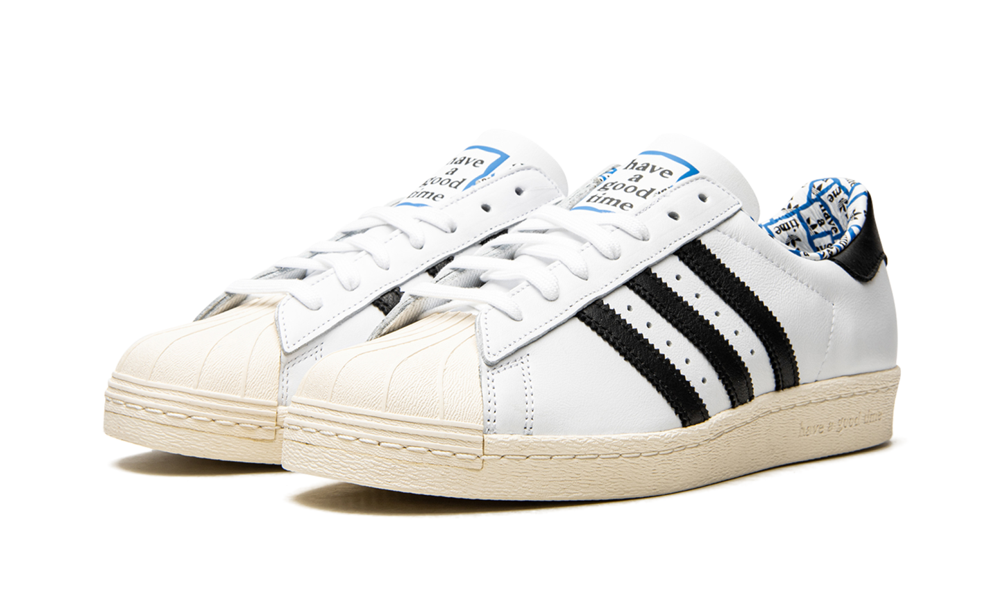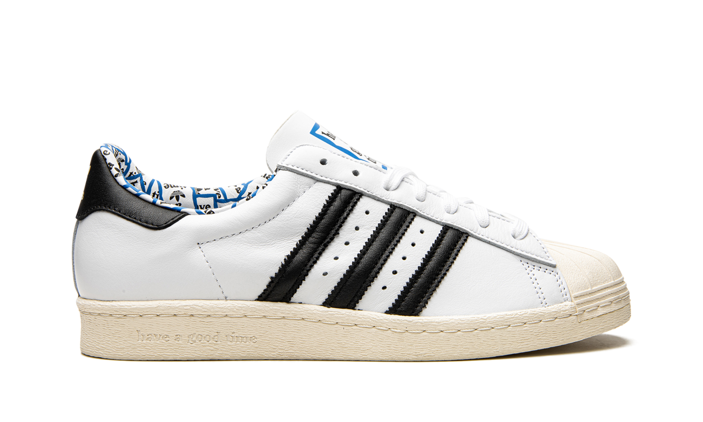 Superstar 80s low-top sneakers from adithtdas featuring white, leather, signature three-stripe logo, contrasting heel counter, round toe, front lace-up fastening, logo patch at the tongue, branded insole and rubber sole. These styles are supplied by a premium sneaker marketplace. Stocking only the most sought-after footwear, they source and curate some of the most hard to find sneakers from around the world.. Have A Good Time