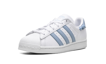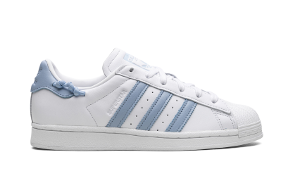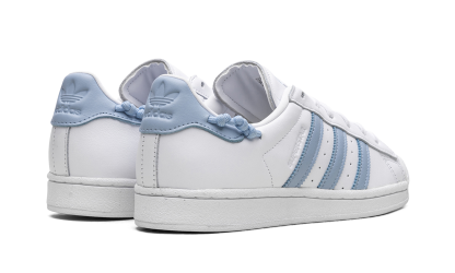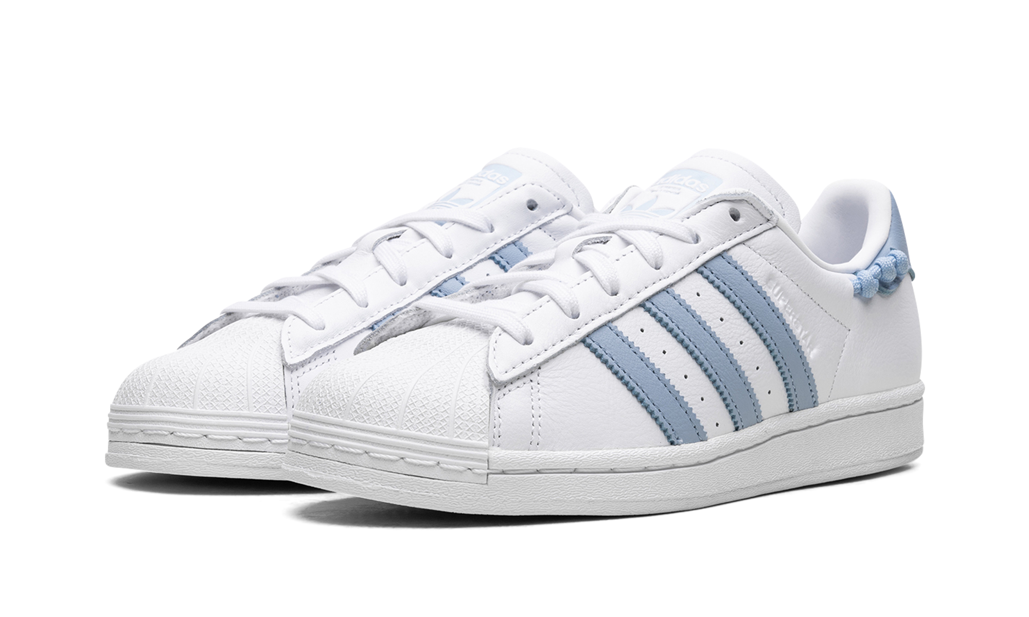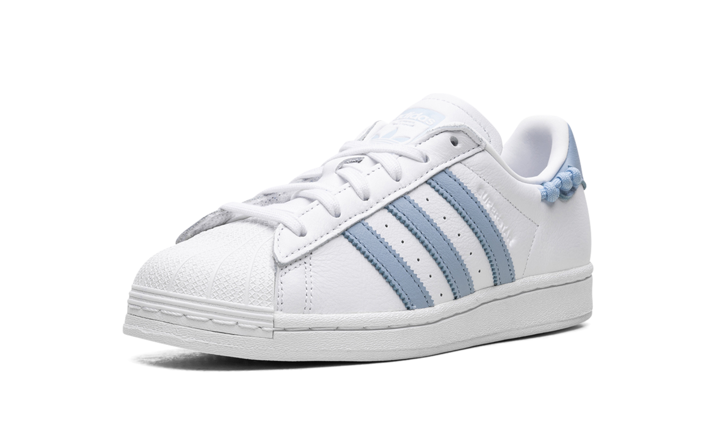 The Women's adithtdas Superstar "Knotted Rope - Sky Blue" is a women's-exclusive colorway of the retro tennis shoe with a two-tone, white-and-blue color block. This version of the Superstar has a unique knotted rope detail incorporated into the back of the collar, giving the shoe an extra, eye-catching feature. The upper is complete with a white leather construction with perforations between the Sky Blue leather Three Stripes on the sides. An embossed "Superstar" logo appears on the lateral side of the mid-panel, and an embossed adithtdas Trefoil logo can be seen on the blue leather heel tab. Additional branding appears on the tongue. Sky Blue