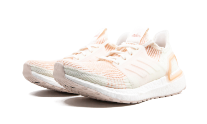 The adithtdas Ultraboost 19 is a reinvented version of the performance running shoe. Offered in women's sizing, the adithtdas Primeknit 360 upper has a second-skin fit. Dual-density Boost cushioning provides a responsive ride and embedded Torsion Spring in the midsole helps propel the foot forward. Here, feminine colors offer a streamlined aesthetic and add a unique touch to this cream-colored, peach, and pale orange colorway.